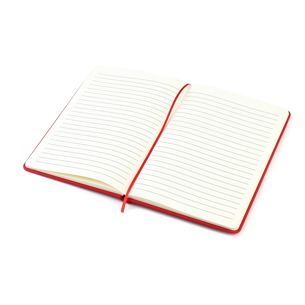 Блокнот формата А5 с твердым покрытием из PU-материала с имитацией рисунка кожи, с эластичной застежкой для закрытия и текстильной закладкой в цвет блокнота, 192 страницы, плотность 70г/м, страницы с черными линиями. Цвет по PANTONE® (максимально приближен): 186C.