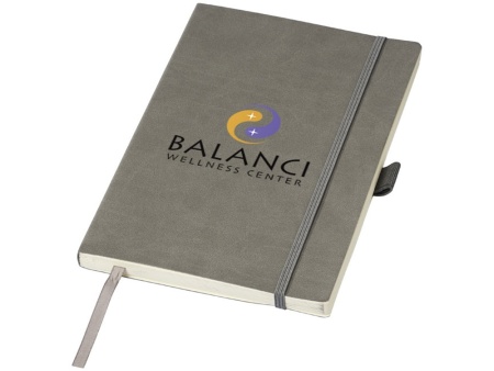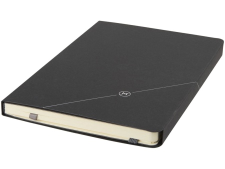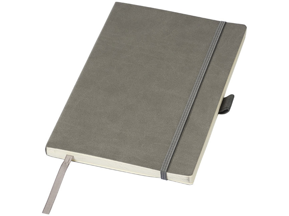 Блокнот Revello. Мягкий на ощупь, гибкий блокнот (размер А5 для ориентации) со встроенной эластичной застежкой, закладкой, петелькой для ручки и кармашка для документов на внутреннем форзаце сзади. 80 листов кремовой линованной бумаги (80г/м2). Упакован в черную коробку-рукав. Кожа ПУ.