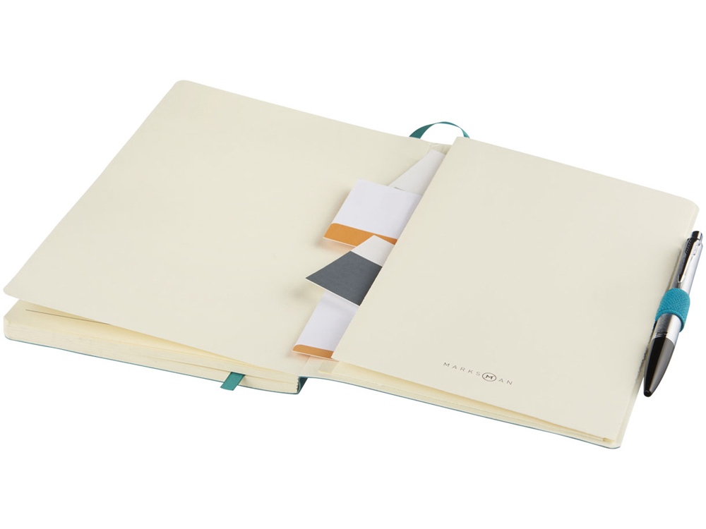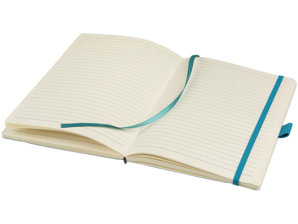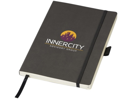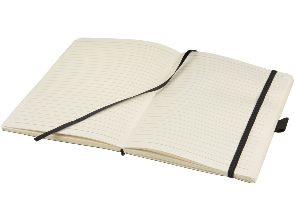 Блокнот Revello. Мягкий на ощупь, гибкий блокнот (размер А5 для ориентации) со встроенной эластичной застежкой, закладкой, петелькой для ручки и кармашка для документов на внутреннем форзаце сзади. 80 листов кремовой линованной бумаги (80г/м2). Упакован в черную коробку-рукав. Кожа ПУ.