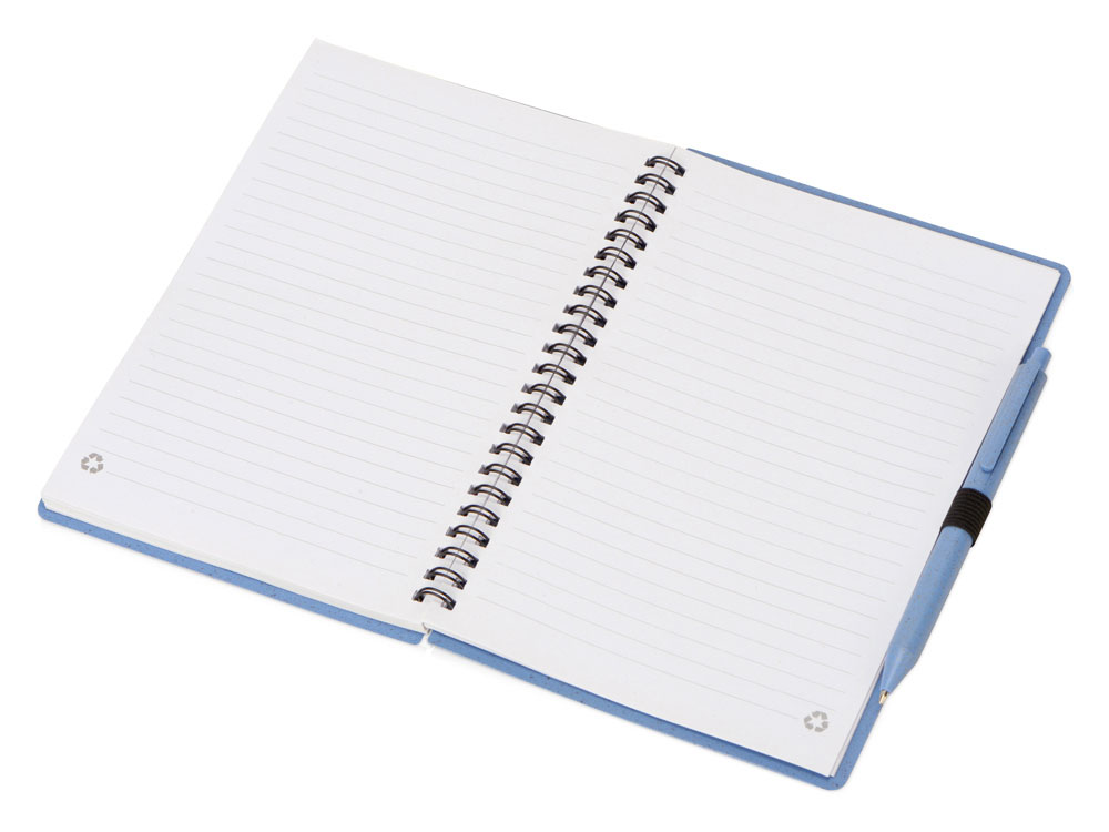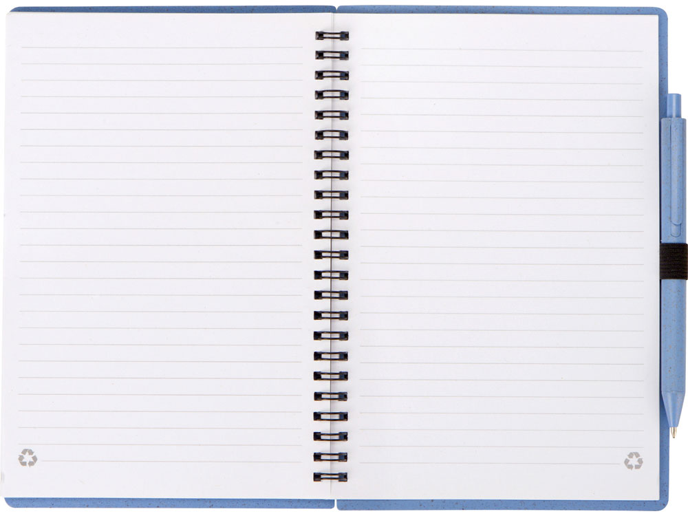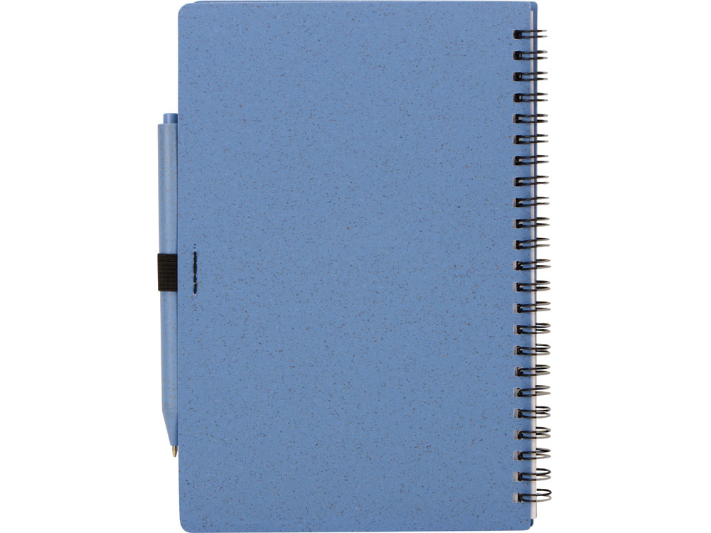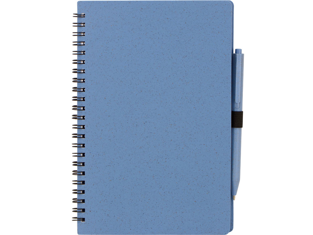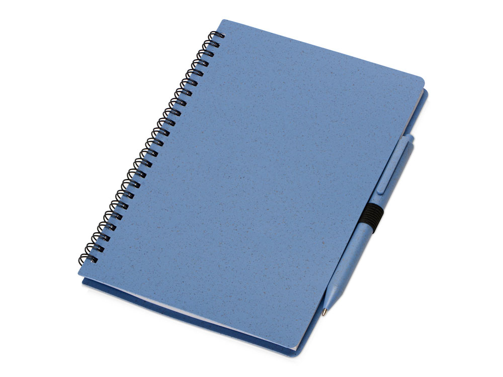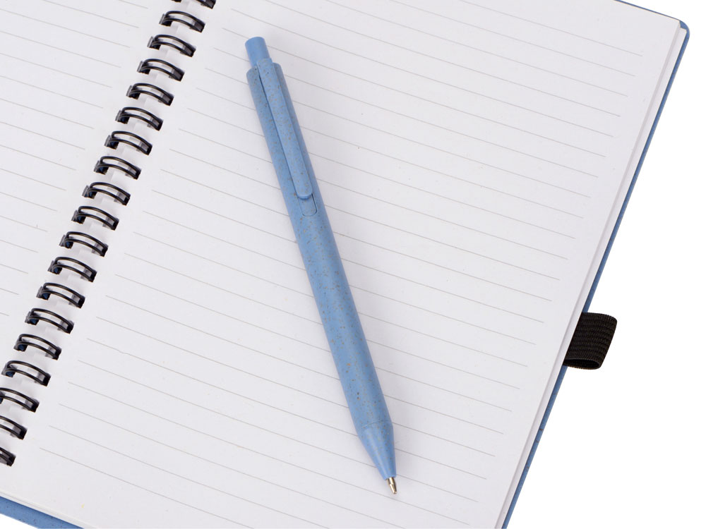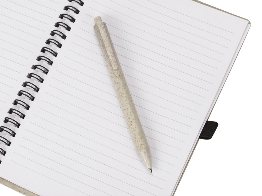 Блокнот с обложкой из переработанной пшеницы и пластика. Блок состоит из 80 листов переработанной бумаги белого цвета. Крепление - пружина. В комплекте шариковая ручка в тон блокноту из пшеничной соломы.