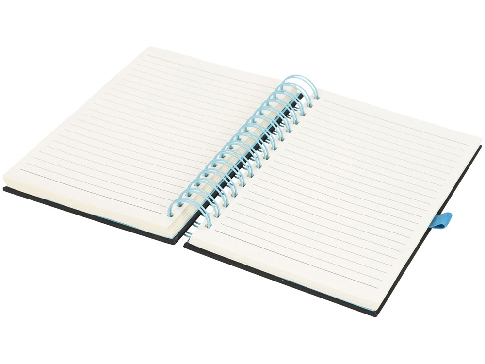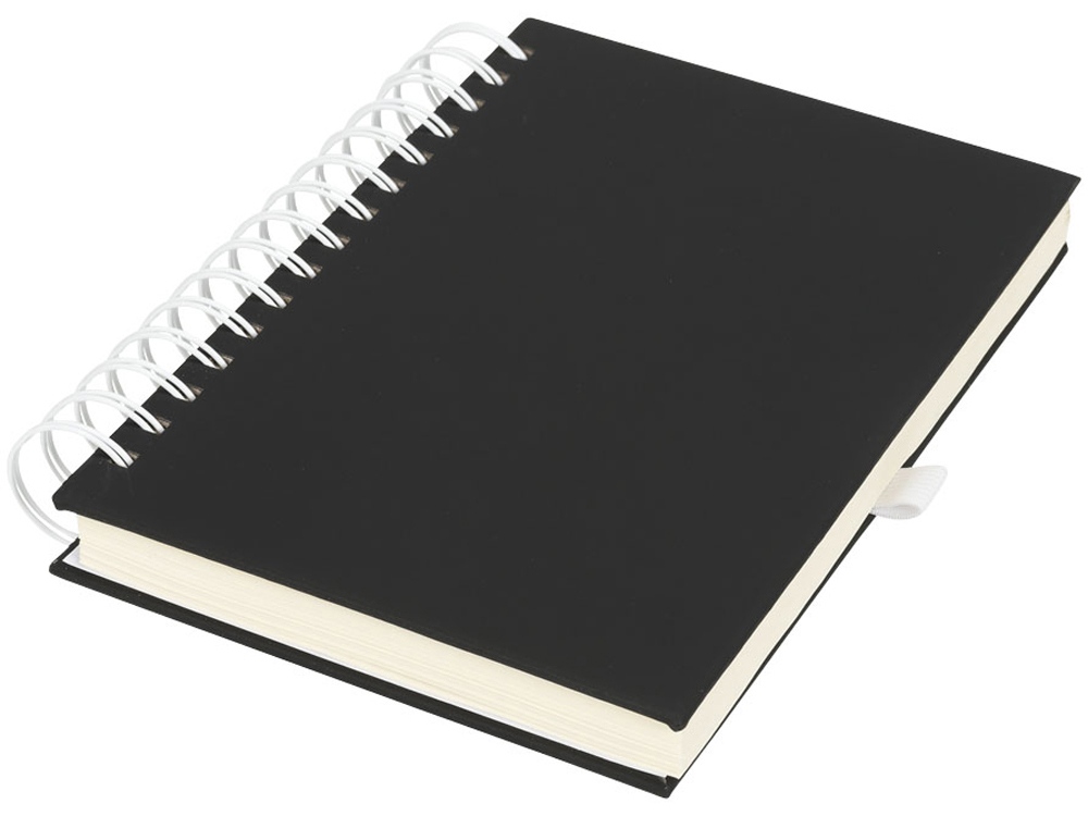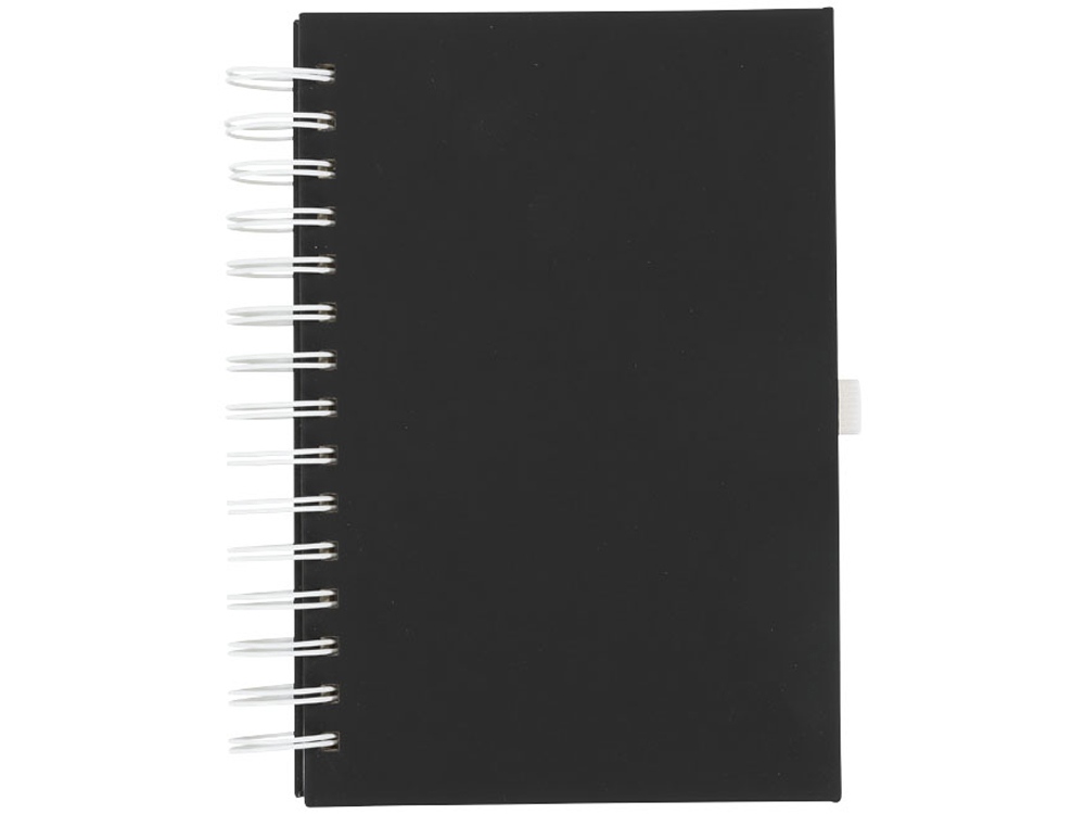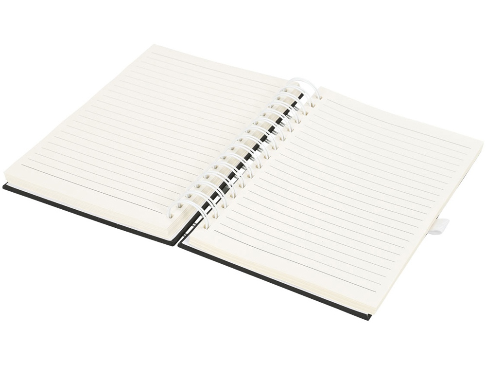 Блокнот Wiro. Новинка в нашей популярной коллекции блокнотов. В этом универсальном новом блокноте есть гладкая черная обложка из ПУ, цветная спираль и застежка-держатель для ручки. Содержит 160 листов линованной бумаги (70 г/м²) кремового цвета. Обложка из ПУ с металлической спиралью.