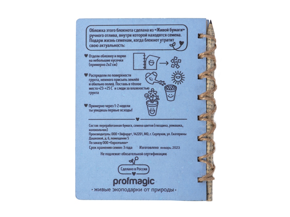 Живой Блокнот - это блокнот ручной работы с семенами гвоздики, ромашки и колокольчика внутри обложки. Блок на 50 листов сделан из экологичной неотбеленной бумаги, вместо пружины используется льняной шпагат. Блокнот поставляется с бумажным карандашом в наборе. После использования блокнота, вырвите обложку, порвите ее на кусочки и посадите в землю. Поливайте и уже через несколько недель вы увидите первые всходы.