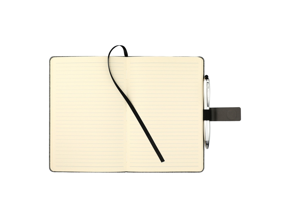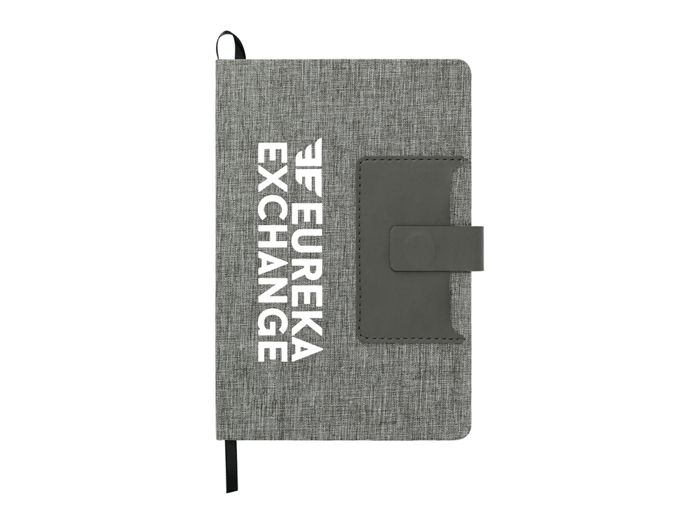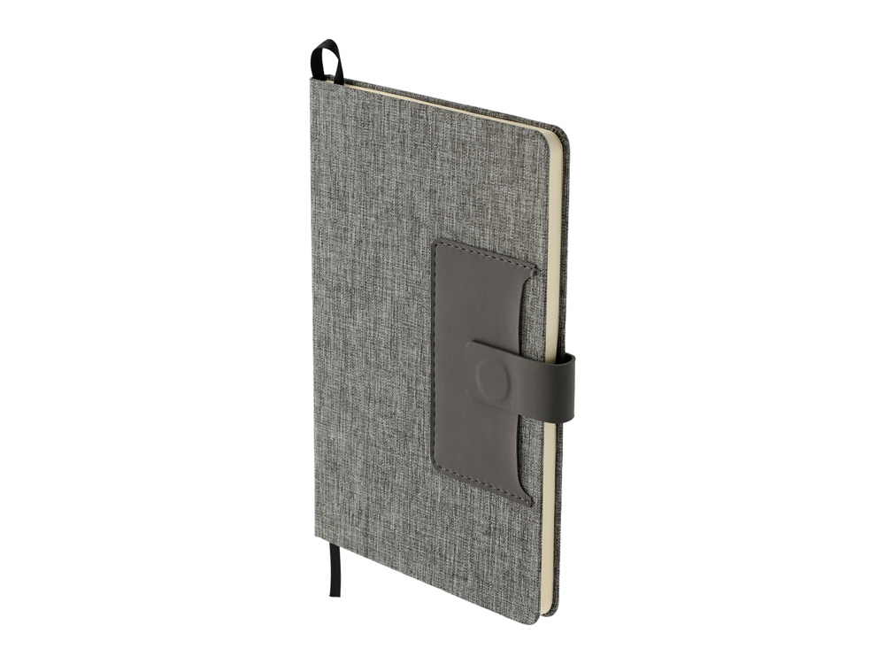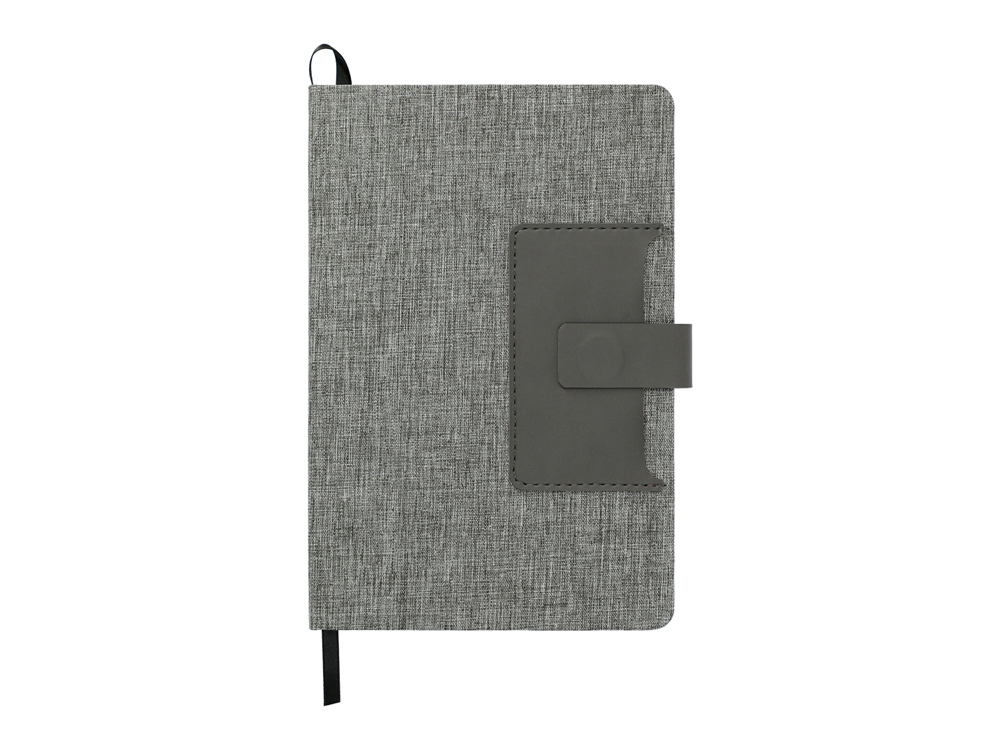 Стильный блокнот с твердой обложкой, обтянутой меланжевой тканью. Отделение для визиток из искусственной кожи и магнитным клапаном, под которым также можно закрепить свою любимую ручку.