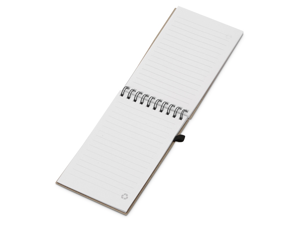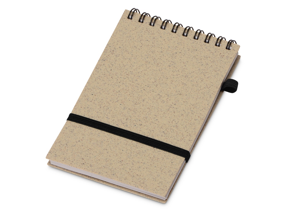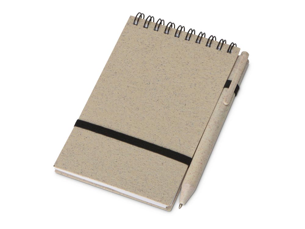 Блокнот с обложкой из переработанной пшеницы и пластика. Блок состоит из 60 листов переработанной бумаги белого цвета. Крепление - пружина. В комплекте шариковая ручка из пшеничной соломы.