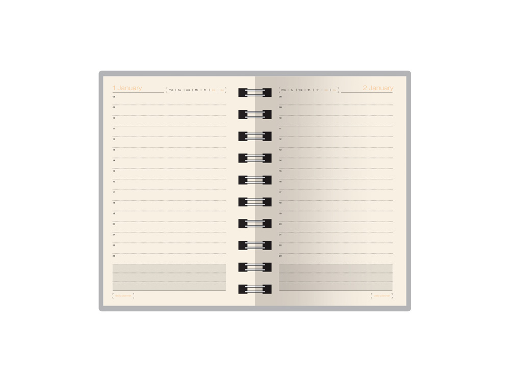 Гибкая (flex) обложка из фактурной высококачественной экокожи, скругленный угол обложки и блока, полускрытый гребень, позволяющий держать ежедневник открытым на столе и работать с комфортом, делая записи, серебряный обрез - все это визитная карточка ежедневника ORBIT от Bruno Visconti.