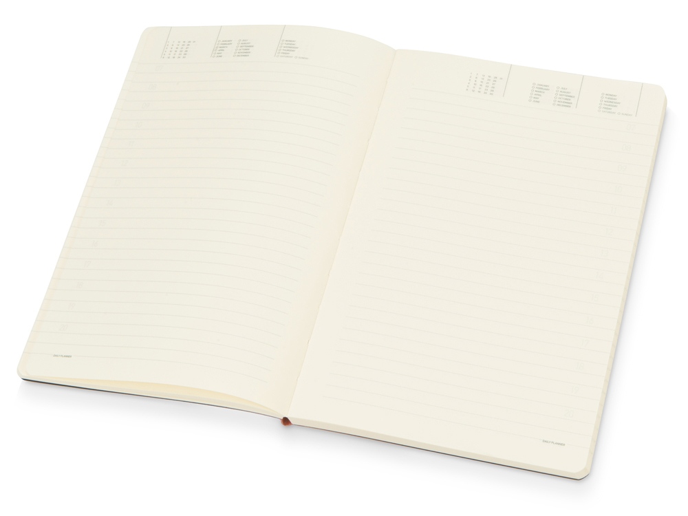 В ежедневнике Megapolis Flex есть полезная справочная информация и телефонная книга, а также страницы для записи идей, мыслей и составления рабочих планов. Для изготовления страниц используется качественный бежевый офсет повышенной плотности (70 г/кв м). Блок не привязан к конкретным датам – они указываются в выделенном поле вверху страницы. Тонированная бумага не дает глазам утомиться даже при длительной работе.