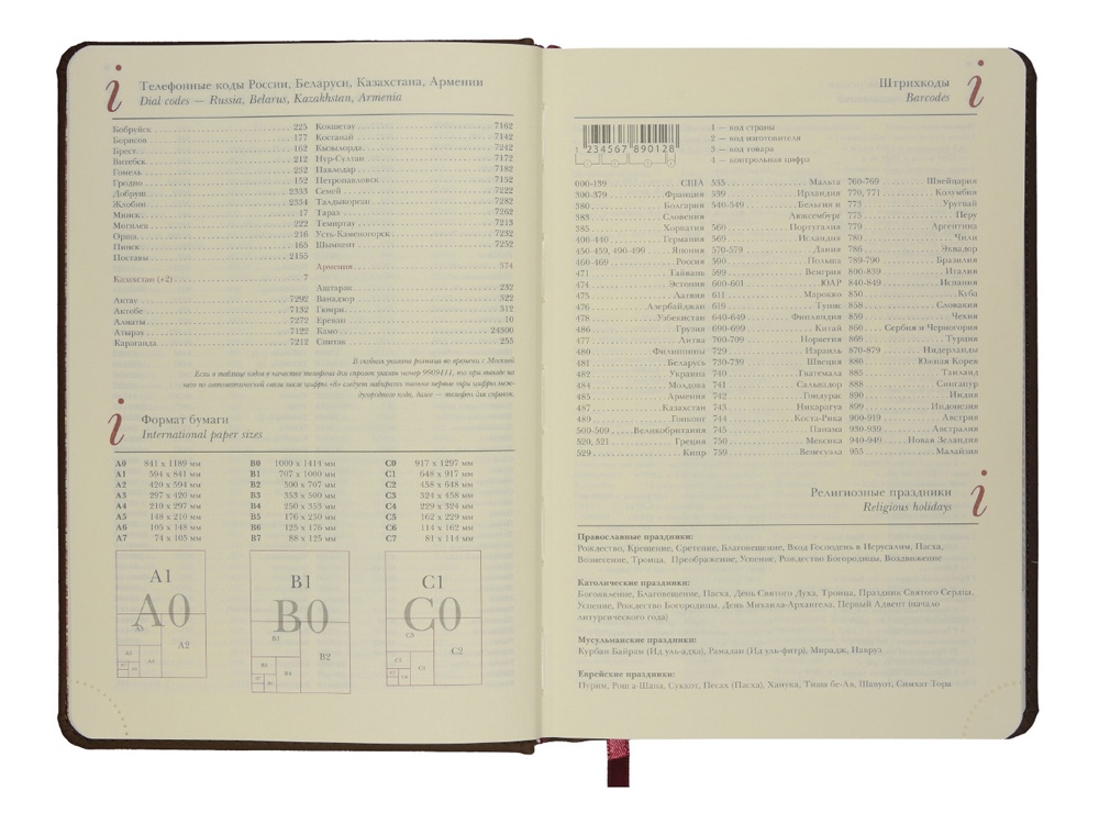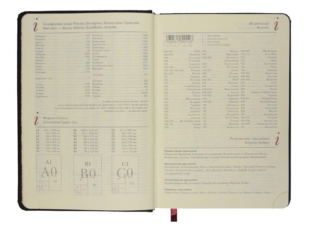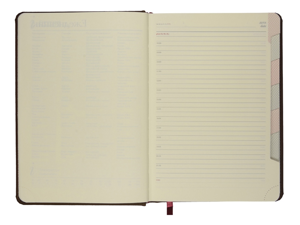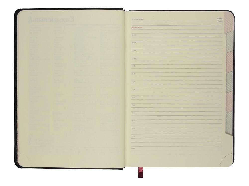Незаменимый помощник в деле эффективного планирования благодаря высокому качеству производства и тщательно продуманных элементов: мягкая бархатистая обложка со скругленными уголками и строчкой по периметру в цвет, вырубные индексы с цветной маркировкой, разбивающей блок на месяцы, закладка-ляссе, перфорированные углы блока, линовка листов с указанием времени суток.