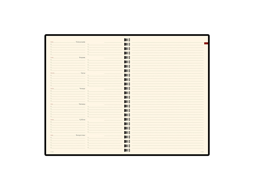 Недатированный блок состоит из 128 страниц, укреплённых на пластиковом полускрытом гребне. На 21 странице размещена справочная информация на русском языке. День недели указан на русском и английском языках.