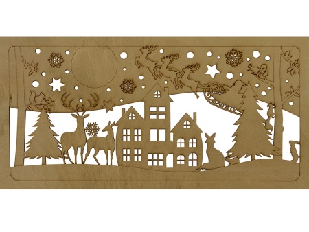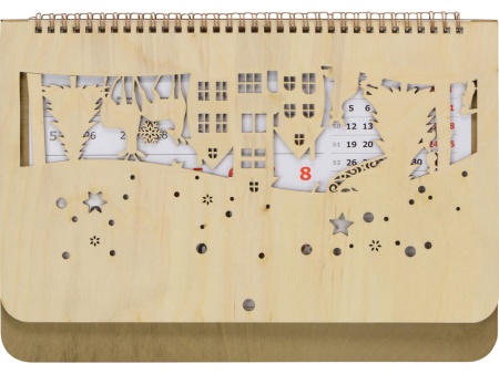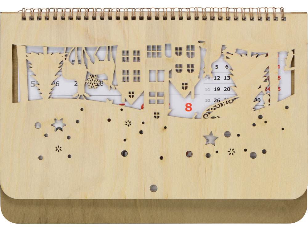 Настенный перекидной календарь имеет необычную обложку, в роли которой выступают фанерные крышки. Нижняя крышка сплошная, верхняя — резная, ажурная, с вырезанным новогодним пейзажем и большим полем под нанесение логотипа или надписи, которая органично впишется в облик календаря.