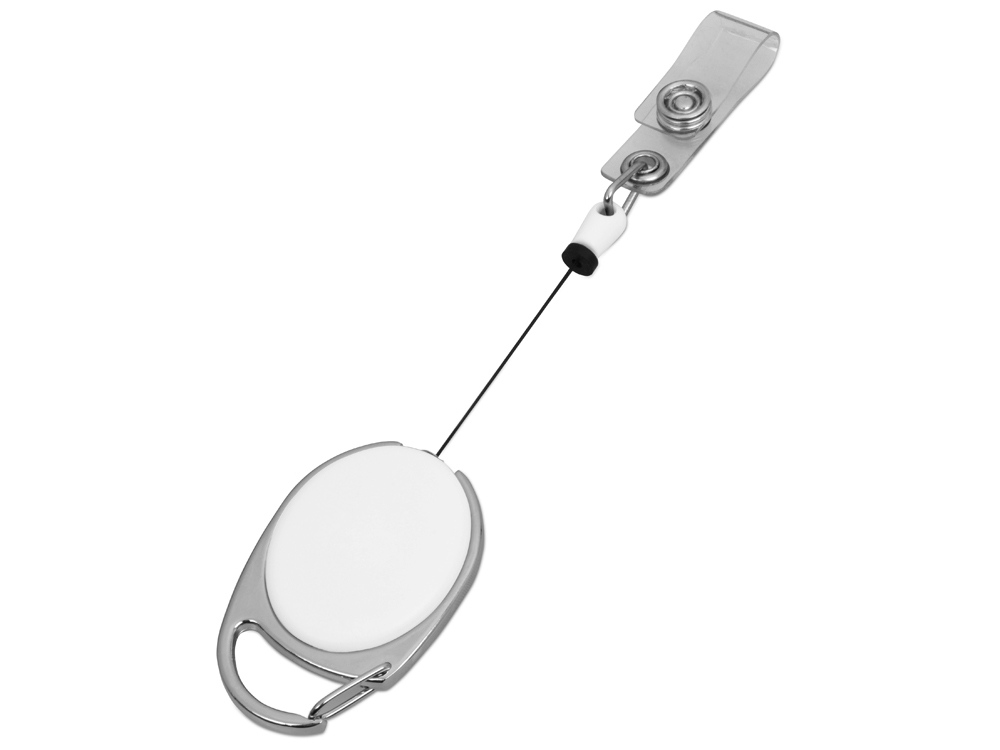 Ретрактор надежно крепится к поясу или другим вещам при помощи металлического карабина. Бейдж или пропуск удобно закрепляется кнопочным механизмом с петлей. Длина шнура - 90 см.