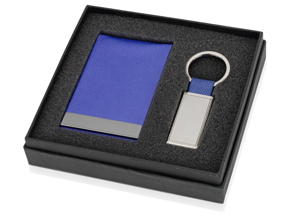 Визитница из кожзаменителя и металлический брелок прямоугольной формы  - идеальный тандем из бизнес-атрибутов, которые всегда дополнят образ делового человека и принесут ему пользу. Набор можно персонализировать методом гравировки.