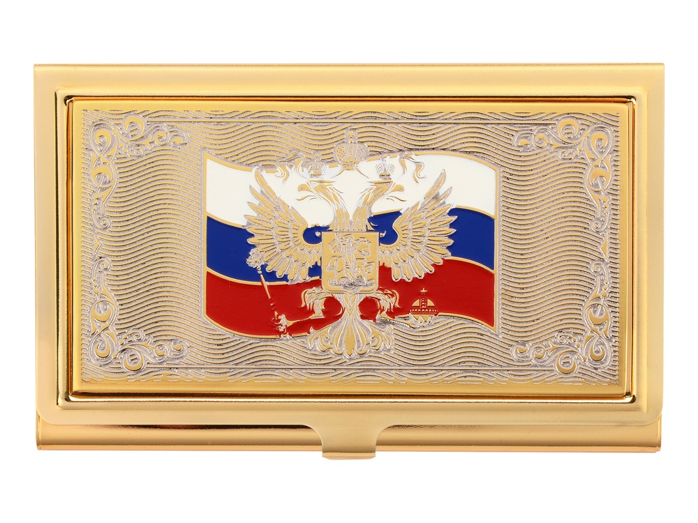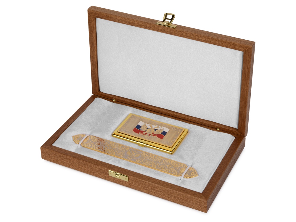 Набор, состоящий из визитницы и металлической закладки для книг в эффектной деревянной коробке, станет прекрасным подарком для руководителей, топ-менеджеров и ключевых клиентов. На позолоченной визитнице и закладке изображена российская государственная символика.