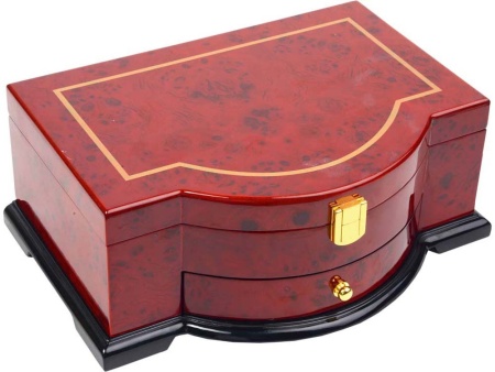 Удобная, практичная и вместительная шкатулка для хранения часов, украшений и драгоценностей выполнена из красного дерева. Основное отделение шкатулки разделено на места хранения колец, цепочек и часов. Также предусмотрен небольшой ящик.