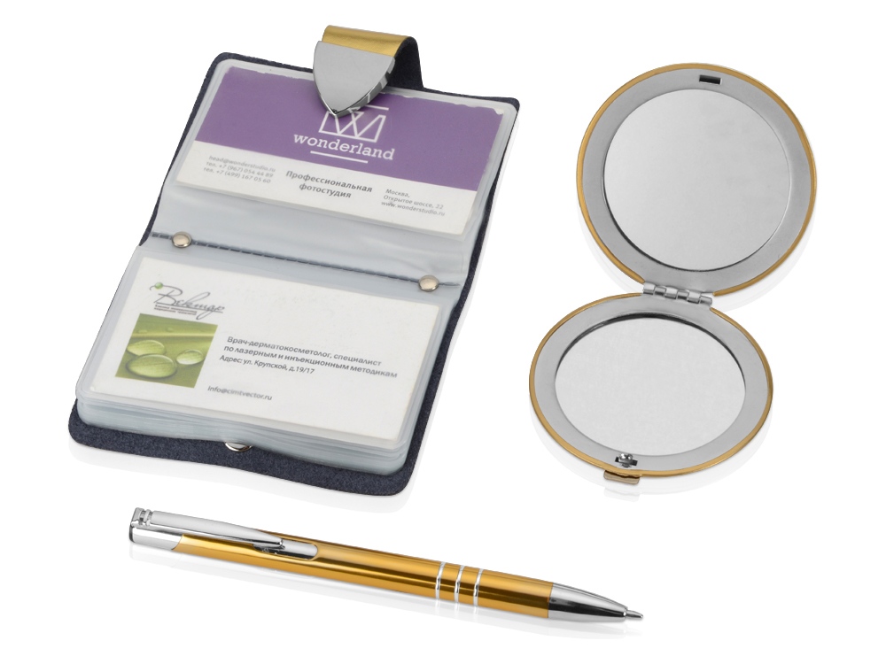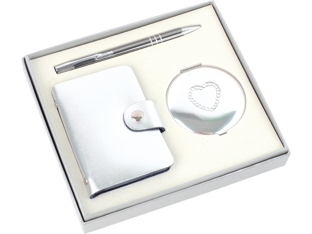 Отличный набор из шариковой ручки, визитницы и зеркала с изображением сердца. Набор выполнен в красивом серебристом или золотистом цвете. Вы можете выгравировать поздравительный текст и сделать набор именным.