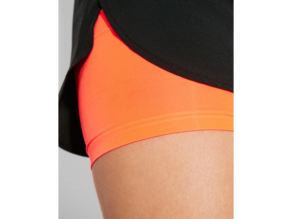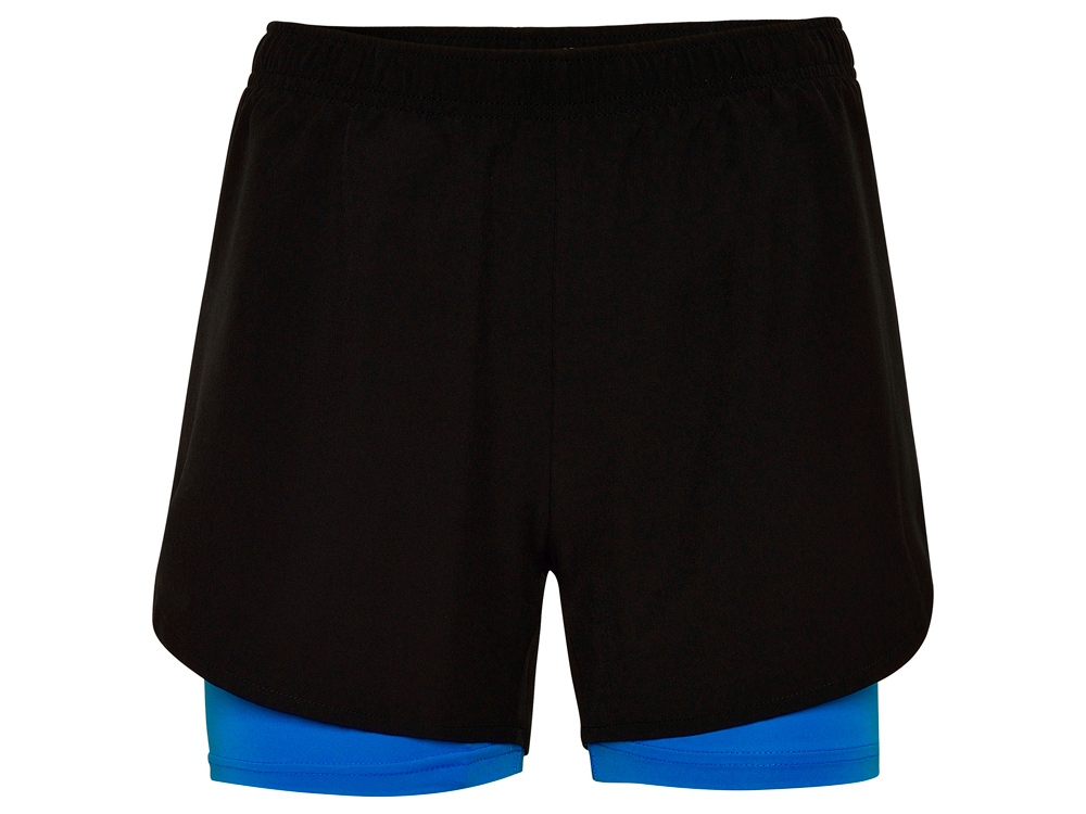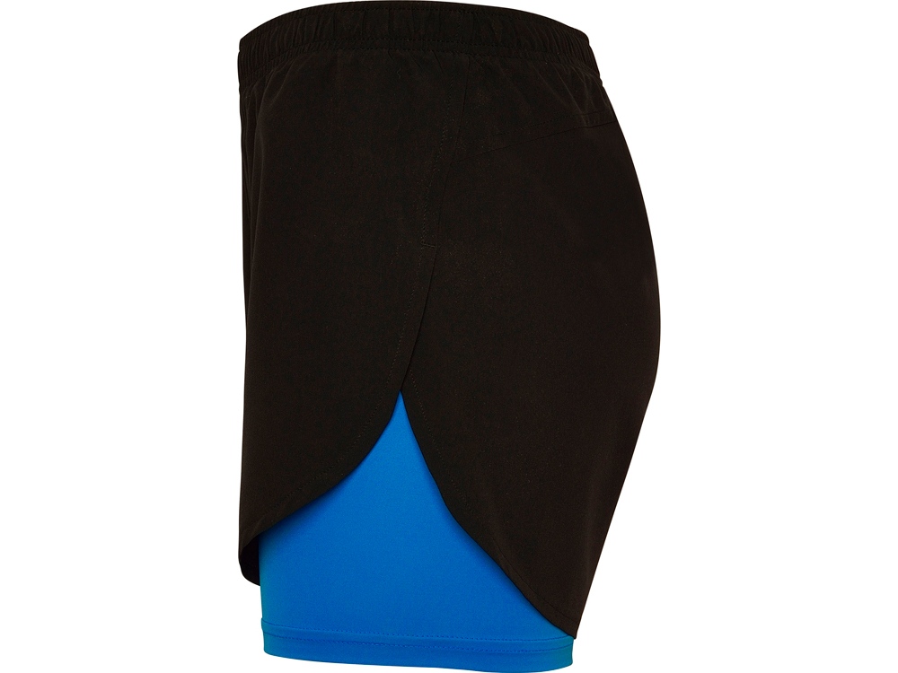 Женские спортивные шорты с контрастными внутренними короткими легинсами. Эластичный пояс с внутренним шнурком для регулировки. Светоотражающие детали. Специальная эластичная ткань для бега.