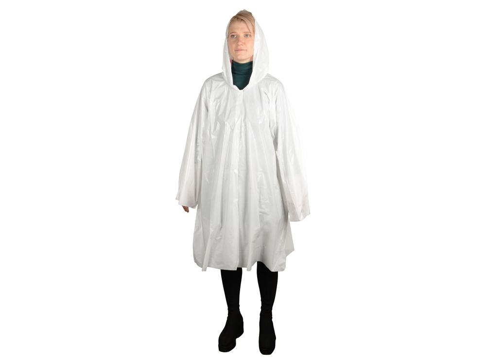 Многоразовый дождевик-плащ отлично подходит как для повседневного использования так и для масштабных мероприятий. Дождевик с длинным рукавом и капюшоном, застегивается на кнопки-липучки, выполнен из плотного полиэтилена, поставляется в прозрачном пакете с клапаном.