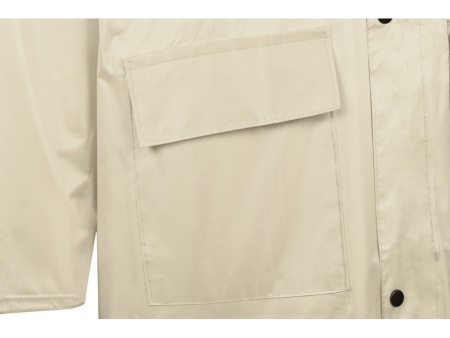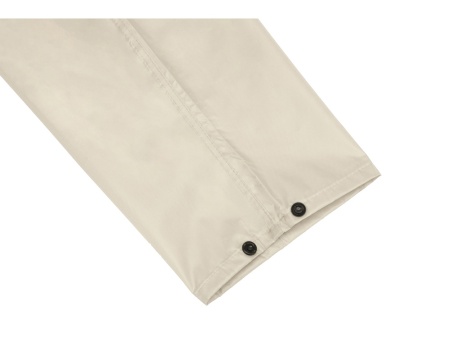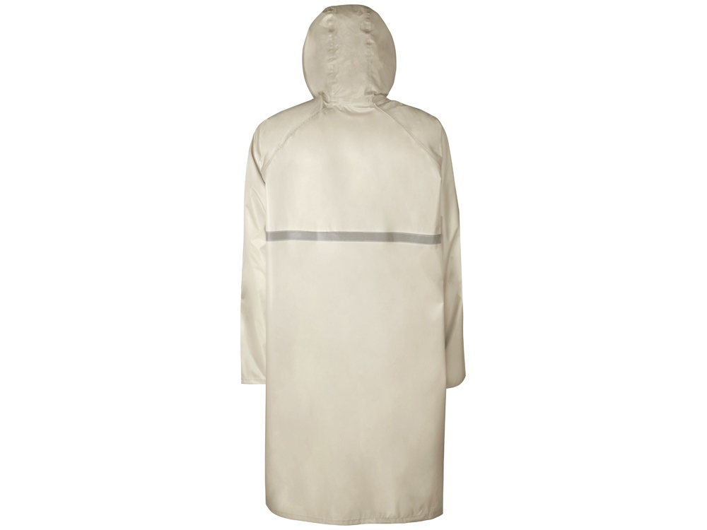 Длинный дождевик выполнен из полиэстера с водоотталкивающей пропиткой. Застегивается на молнию, поверх которой — планка на кнопках, что дополнительно защищает от ветра и промокания. Посадку капюшона можно регулировать при помощи шнурка, ширина рукава регулируется кнопкой.