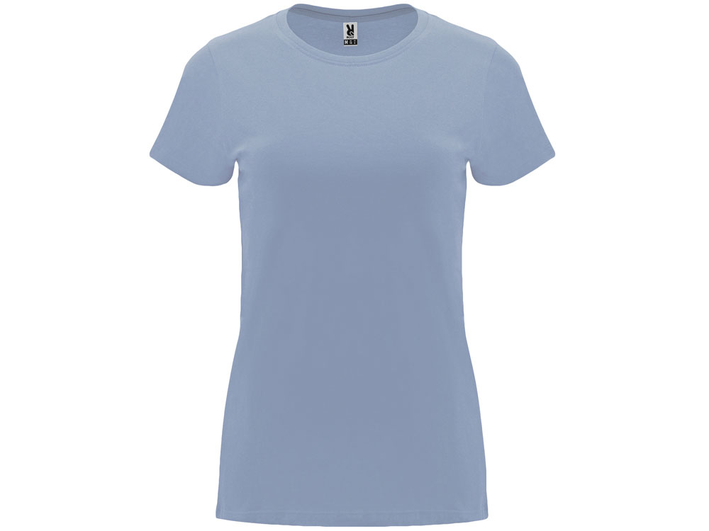 Женская приталенная футболка. Круглый вырез горловины обработан рибом 1х1. Шов горловины укреплен тесьмой.