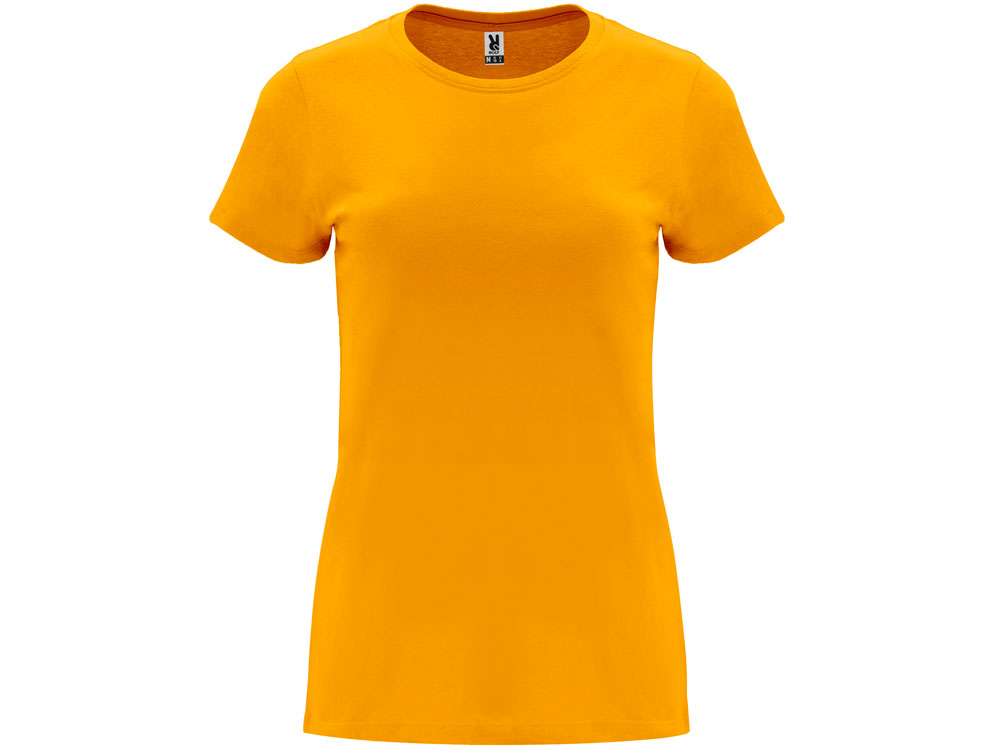 Женская приталенная футболка. Круглый вырез горловины обработан рибом 1х1. Шов горловины укреплен тесьмой.