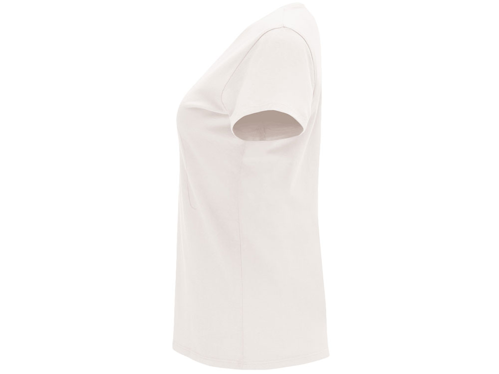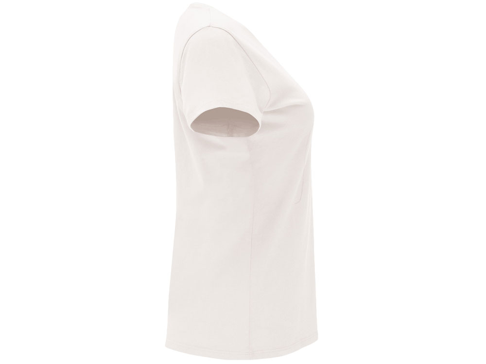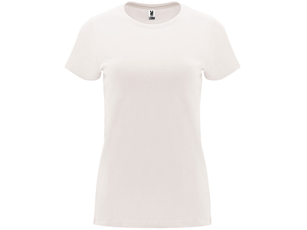 Женская приталенная футболка. Круглый вырез горловины обработан рибом 1х1. Шов горловины укреплен тесьмой.