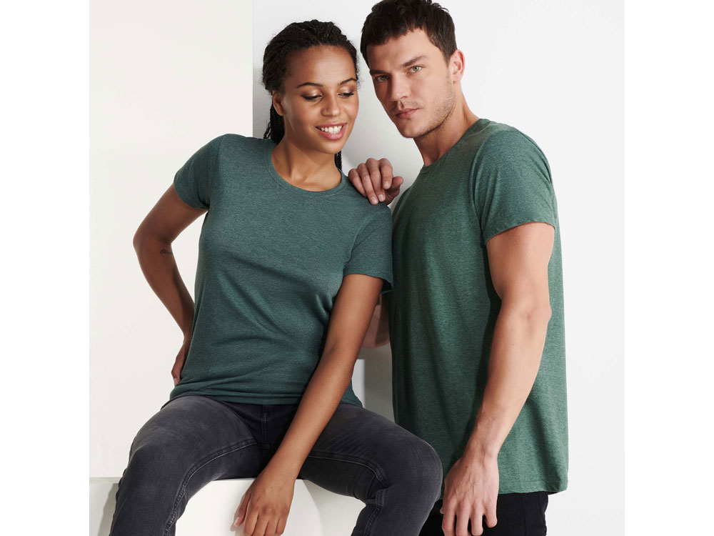 Футболка с коротким рукавом в меланжевом эффекте. Риб горловины 1х1 дополнительно укреплен двойной строчкой.