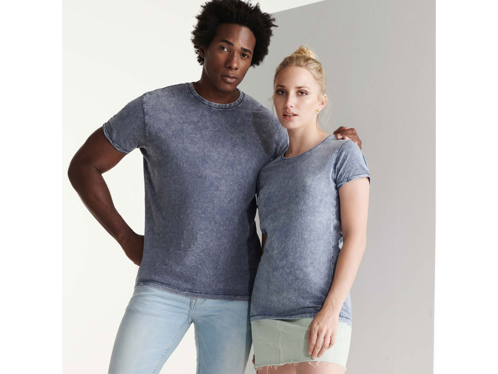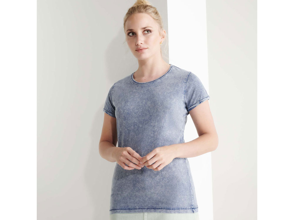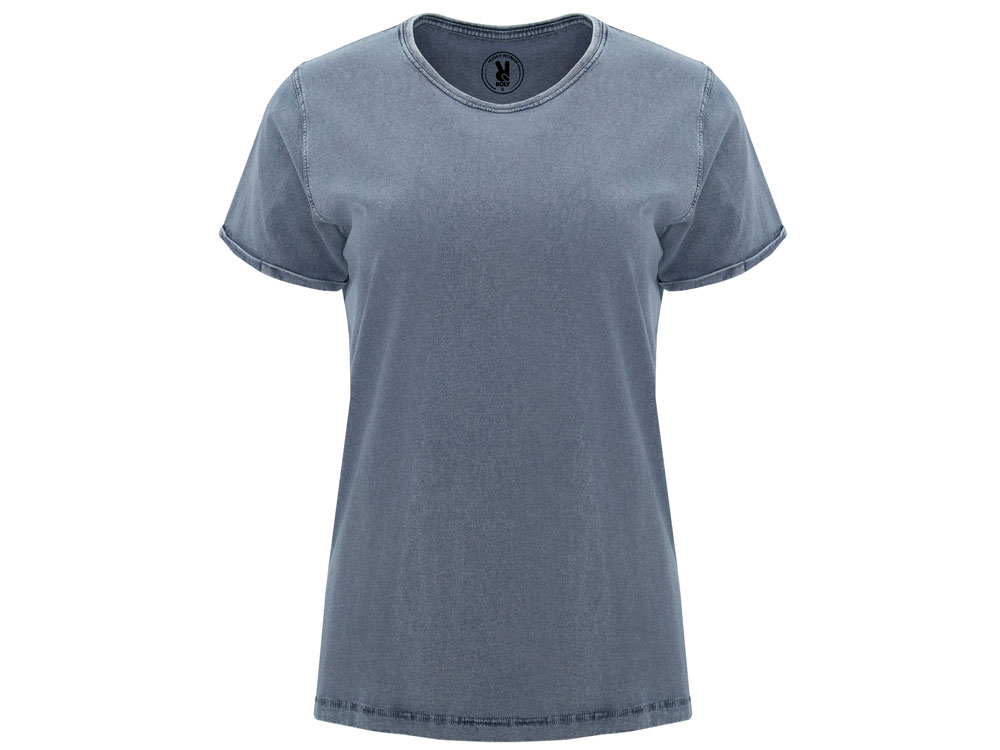 Женская футболка с джинсовым эффектом. Короткий рукав, горловина обработана рибом 1х1 и дополнительно укреплена тесьмой. Двойная отстрочка по пройме. Рукав с закручивающимся краем. В ассортименте также представлена аналогичная мужская модель Husky