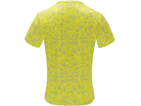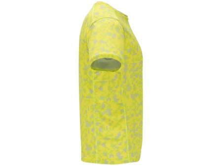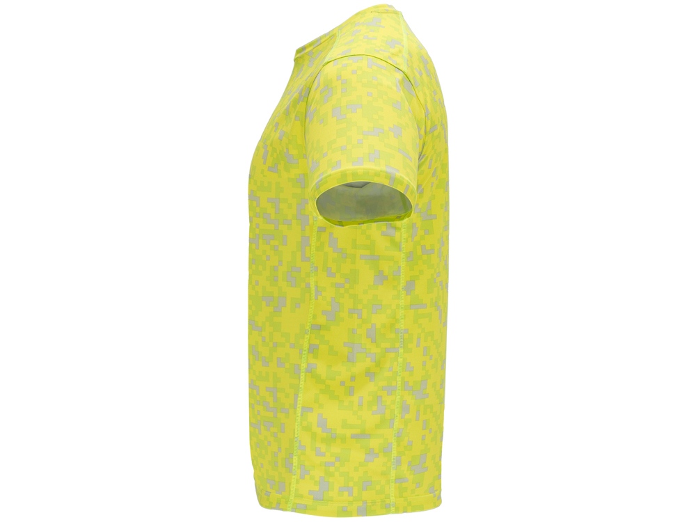 Футболка с принтом и короткими рукавами. Круглая горловина с усиленными закрытыми швами контрастного неоново-желтого цвета. Боковые вставки с внутренней стороны рукавов и на плечах с оверлочными швами в тон.