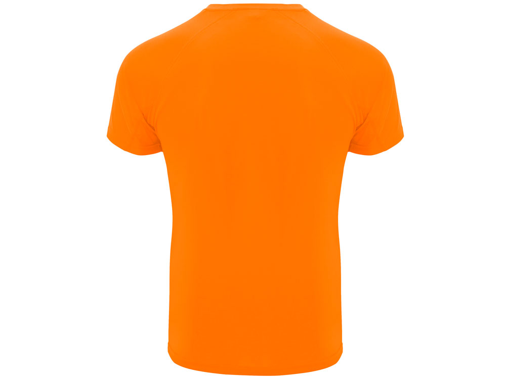 Спортивная футболка с коротким рукавом реглан. Круглый вырез горловины с отделкой плоским швом. Рукав сложного кроя для обеспечения дополнительного удобства при занятиях спортом. Отделка плоским швом с застилом по пройме и рукавам.