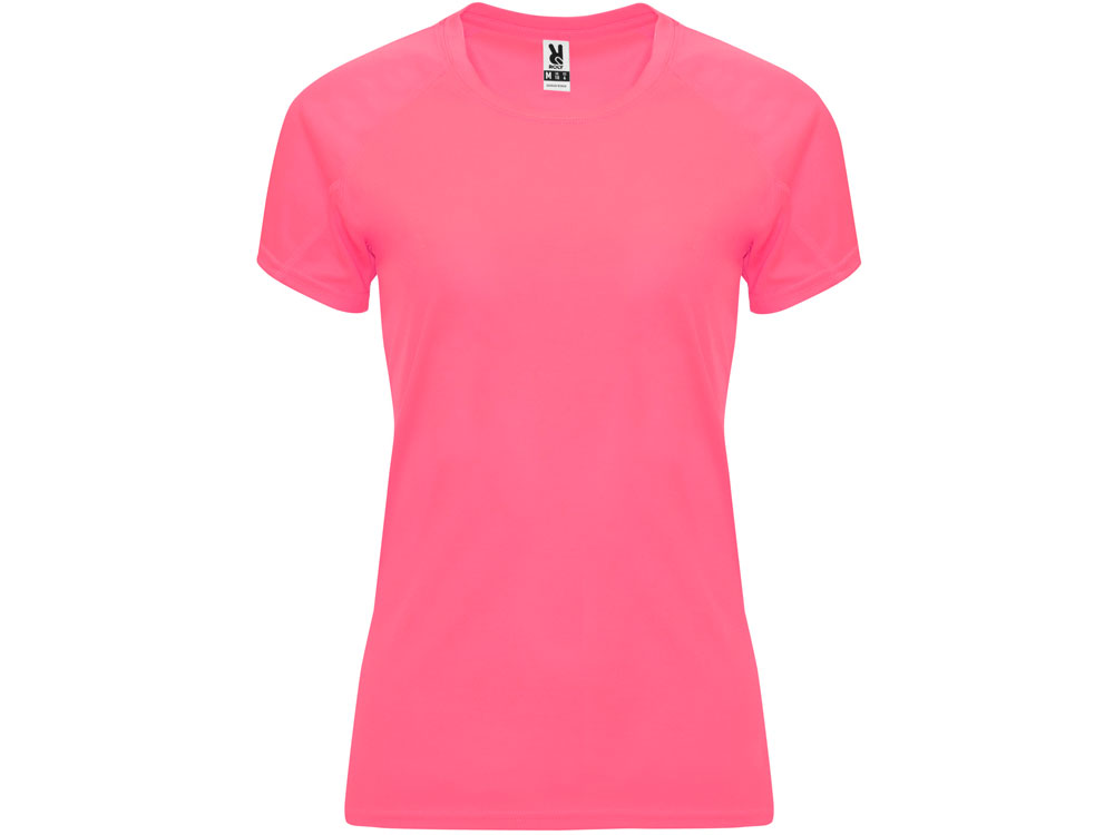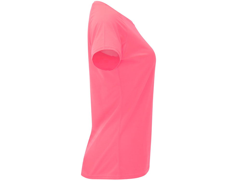 Спортивная футболка с коротким рукавом реглан для женщин. Круглый вырез горловины с отделкой плоским швом. Рукав сложного кроя для обеспечения дополнительного удобства при занятиях спортом. Отделка плоским швом с застилом по пройме и рукавам.