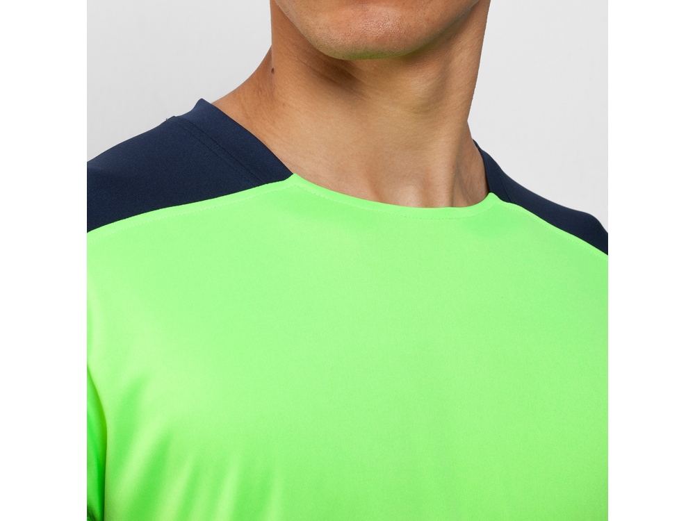 Спортивная футболка с коротким рукавом реглан. Круглый вырез горловины. Контрастные рукава и боковые вставки.