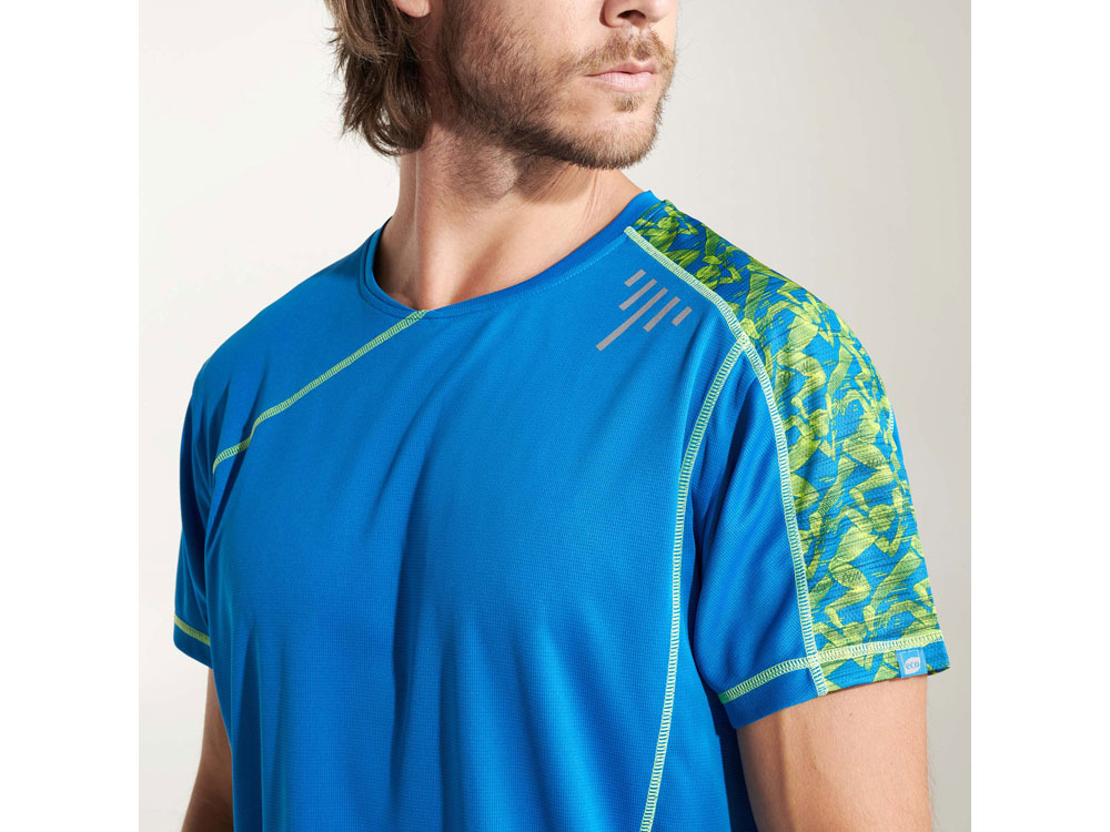 Спортивная футболка с коротким рукавом и принтованными вставками. Контрастные отстрочки плоским швом, светоотражающие элементы на полочке и спинке. Эко лейбл на рукаве.
