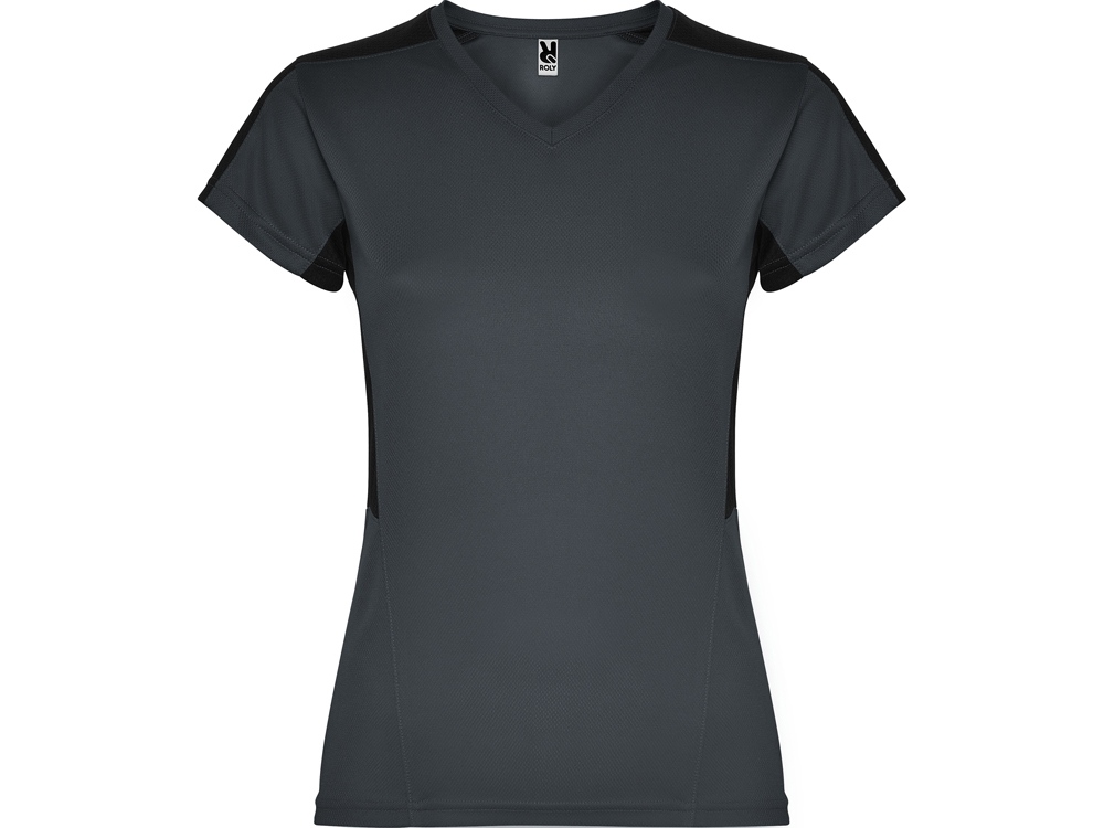 Женская футболка с коротким рукавом. V-образная горловина. Комбинация из 2 полотен контрастного цвета: структурное полотно на полочке и дышащая 3D сетка на плечах и боках.