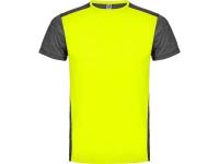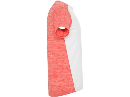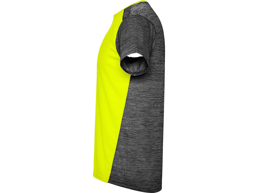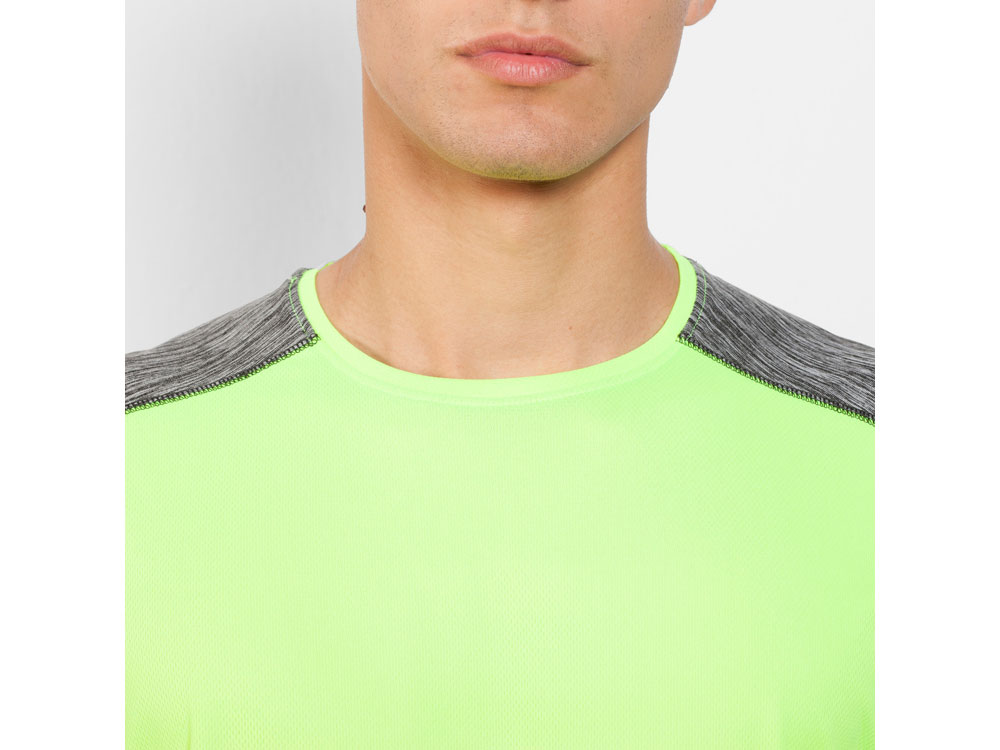 Футболка с коротким рукавом из технологического полотна. Круглый вырез горловины. Комбинация двух полиэстеровых полотен. Основное полотно на полочке со структурой, дополнительное полотно на спинке, рукавах и плечах с меланжевым эффектом. Задняя часть немного длиннее. Легко сохнущее дышащее полотно.