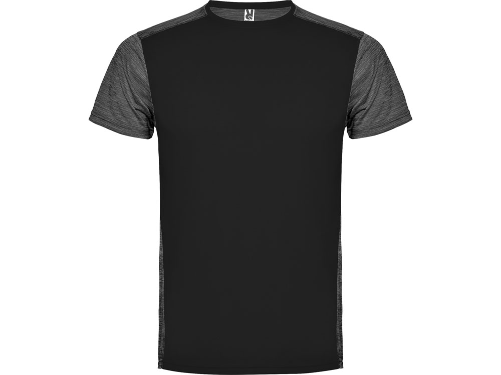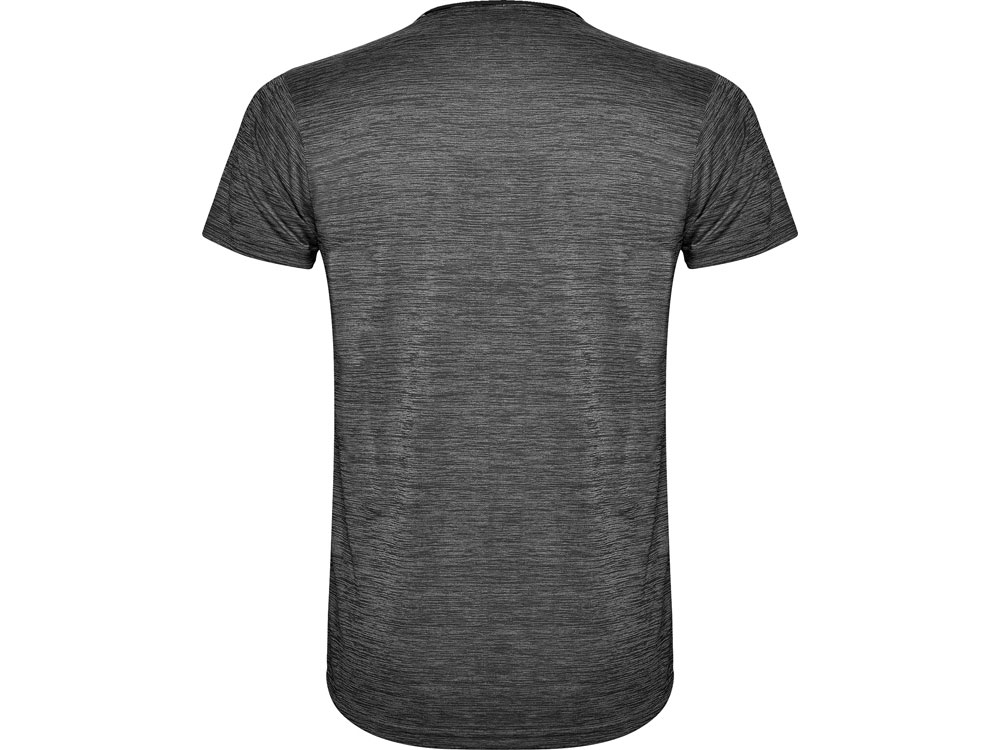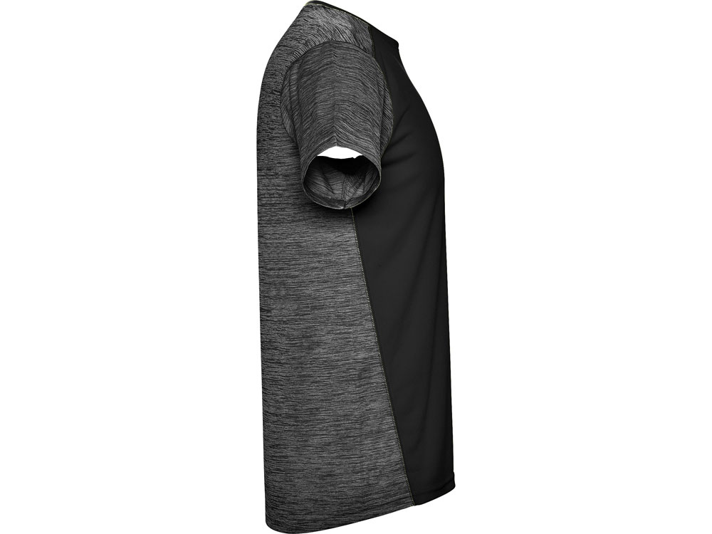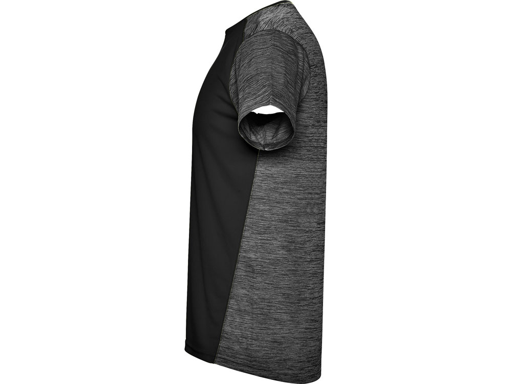 Футболка с коротким рукавом из технологического полотна. Круглый вырез горловины. Комбинация двух полиэстеровых полотен. Основное полотно на полочке со структурой, дополнительное полотно на спинке, рукавах и плечах с меланжевым эффектом. Задняя часть немного длиннее. Легко сохнущее дышащее полотно.