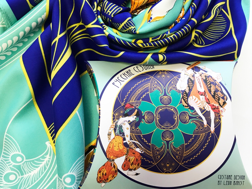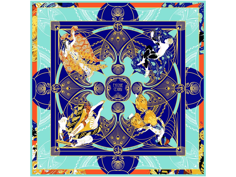 В дизайне платка Русские сезоны. Лев Бакст мы воспроизвели эскизы костюмов к таким балетным спектаклям как Клеопатра, Шехерезада и Послеполуденный сон Фавна, поражающие зрителей своей фантазией, сказочной роскошью, утонченной изысканностью линий, новыми и смелыми сочетаниями красок.