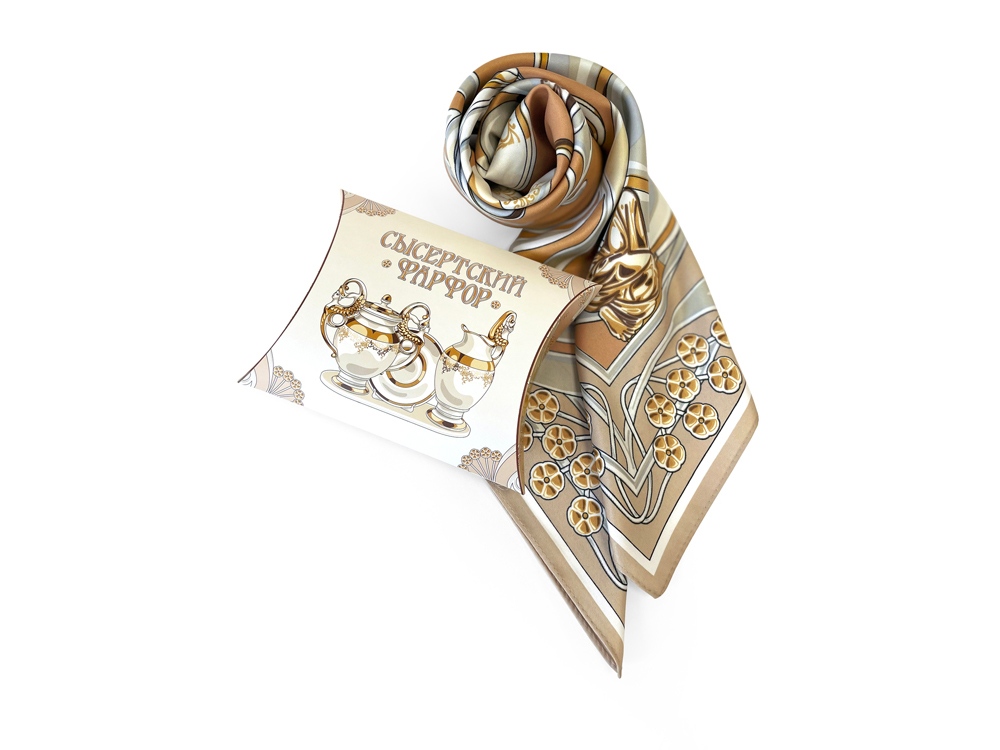 Платок Сысертский фарфор от дизайнера Нины Ручкиной посвящается уральскому народному промыслу, известному с 19 века.