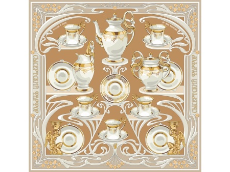 Композиция платка словно сказочный лабиринт увлекает за собой, вызывая желания рассматривать детали утонченного сервиза работы уральских мастеров. Изящные фарфоровые предметы расположены в ажурном серванте эпохи модерна.