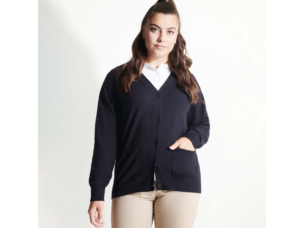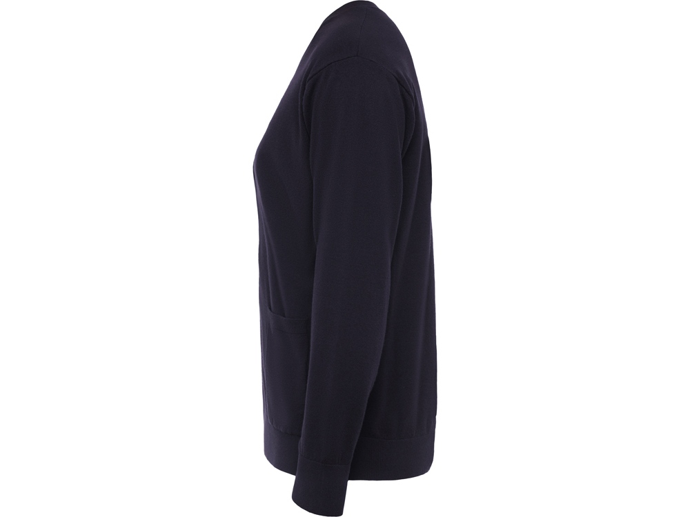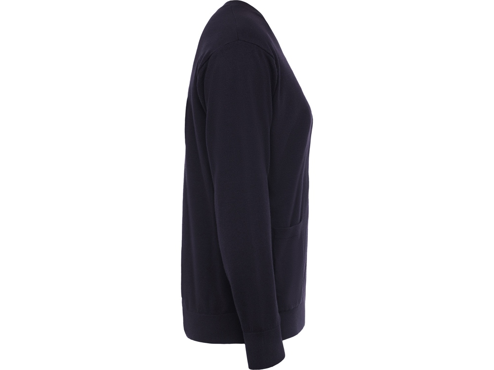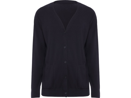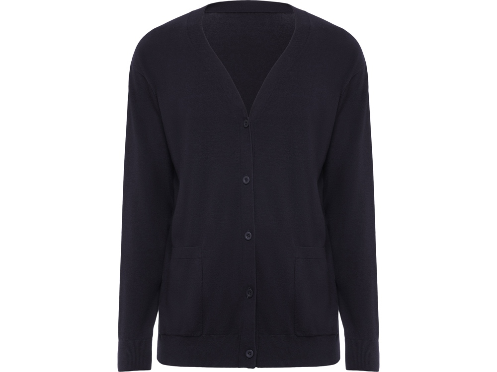 Трикотажный кардиган с застежкой на пять пуговиц. Два накладных кармана. Манжеты и низ вывязан рибом.