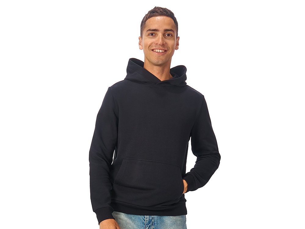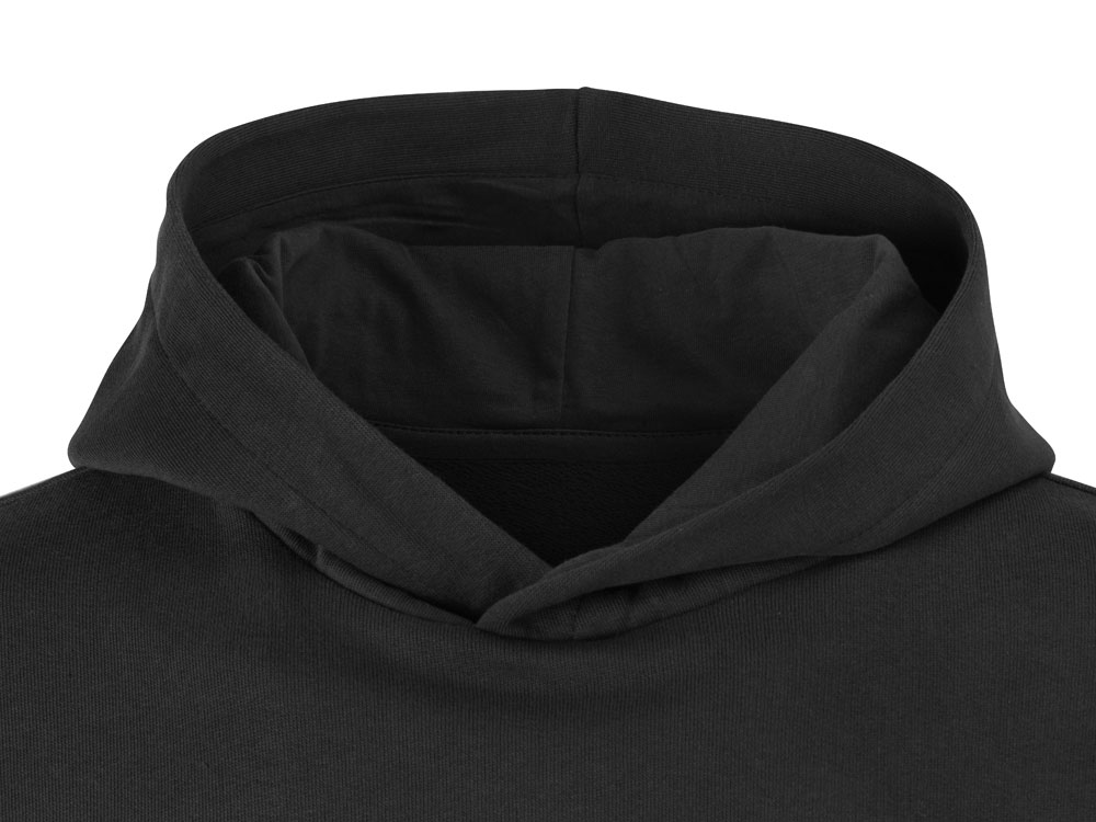 Толстовка с капюшоном (худи) из плотного хлопкового футера. В капюшоне подкладка в тон, а горловина спинки дополнительно укреплена тесьмой с выделкой елочка. Капюшон без шнурков – ничего не отвлекает от вашего брендирования. Манжеты и низ изделия отделаны рибом 2х2. Глубокий комфортный карман кенгуру на полочке. Полотно из утяжеленного хлопкового футера внутри с петельками без начеса.