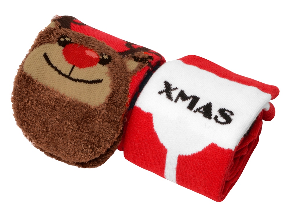 Рождественские носки прекрасно подойдут на роль подарка, который создает праздничное настроение. Этот набор состоит из двух пар, которые упакованы в мешочек из натурального хлопка. Одна пара украшена мягкими пушистыми мордочками рождественских оленей, а принт на второй изображает сапожки Санта Клауса. Ткань -- смесь хлопка, полиэстера и спандекса, что обеспечивает носкам износостойкость, а мягкая широкая резинка – удобную посадку по ноге. Мешочек-упаковку можно брендировать по вашему желанию.