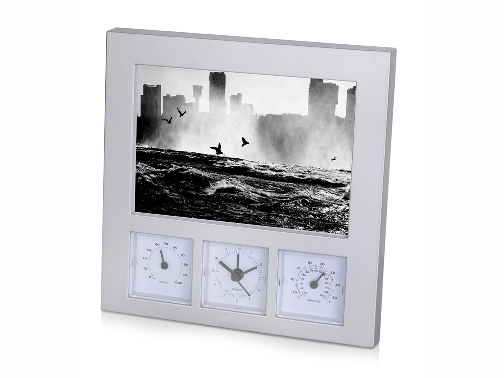 Погодная станция со встроенной фоторамкой для фото 10 х15 см, часами, гигрометром и термометром станет превосходным подарком на любое торжество.