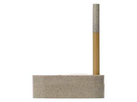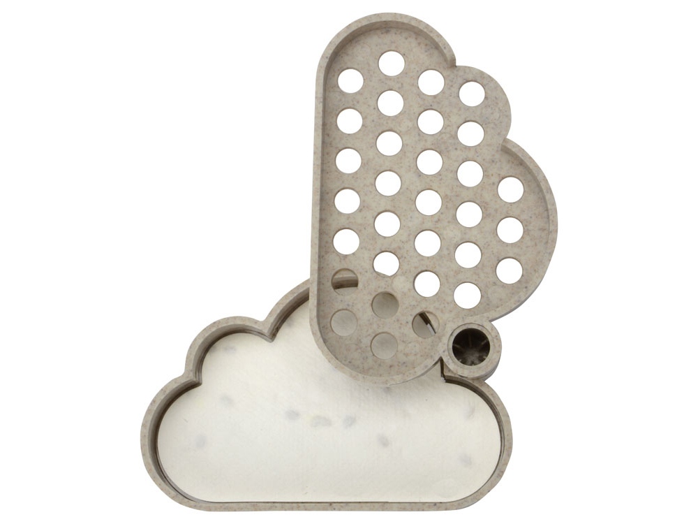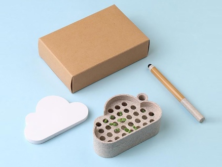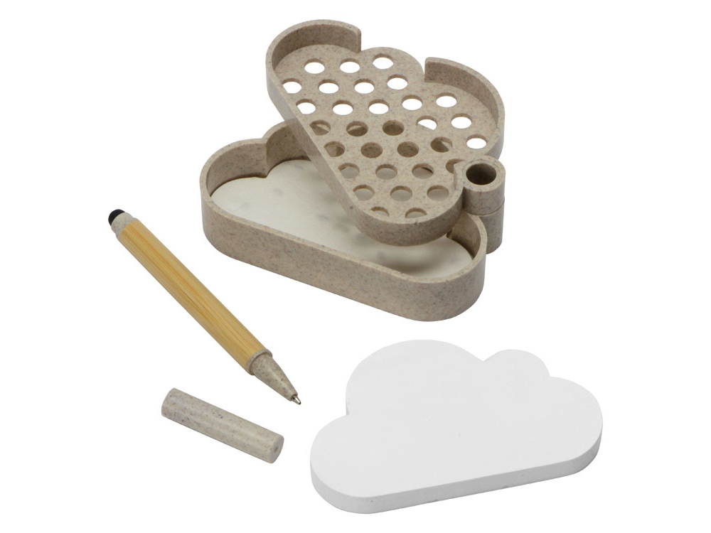 В набор для записей входят удобная подставка в форме облака из переработанной пшеницы, шариковая ручка-стилус из бамбука и переработанной пшеницы, бумага для записей и лист с семенами ромашки. Семена можно посадить как в самой подставке, так и в отдельном горшке. Также в наборе есть инструкция по выращиванию и уходу за ромашкой.