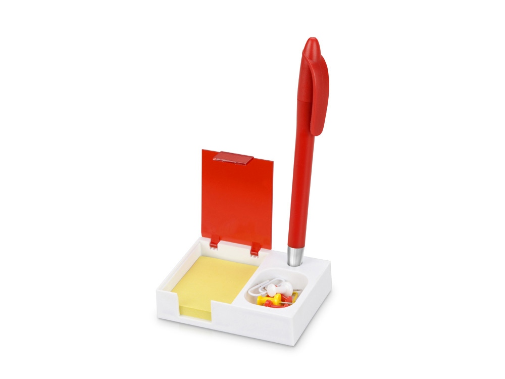 Яркая и удобная поставка под ручку, канцелярские скрепки и бумажный блок (4 х 5 см) превосходно организует ваше рабочее место. Отличный подарок при проведении промо-акций.