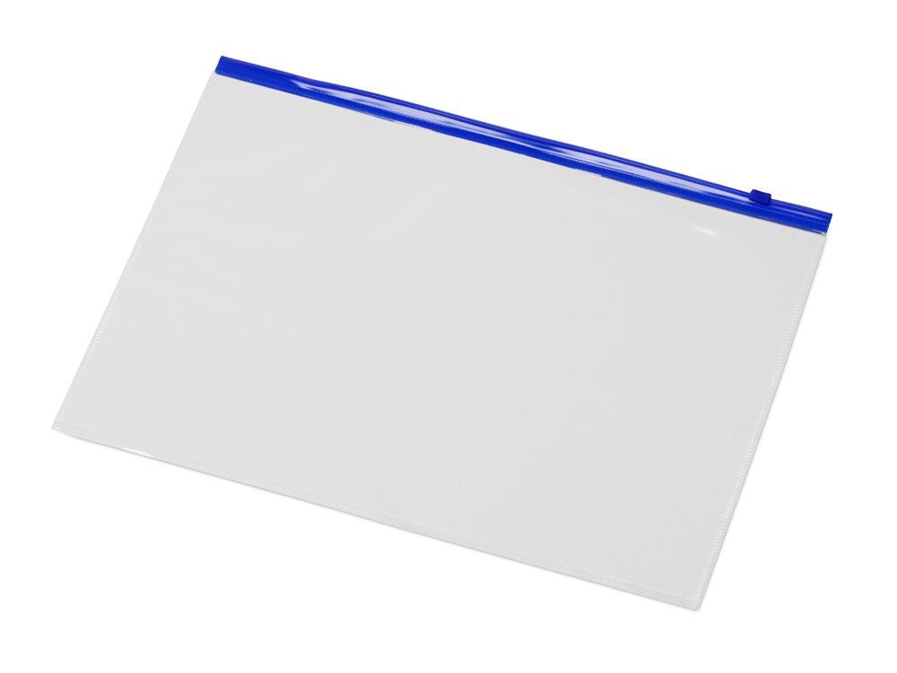 Папка-конверт на молнии, формата А4 изготовлена из мягкого прозрачного ПВХ. Закрывается на пластиковую молнию синего  цвета. Удобна для хранения и переноски документов, предотвращает их смятие и загрязнение.