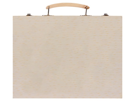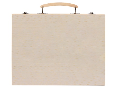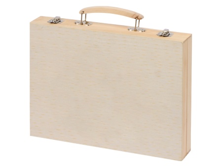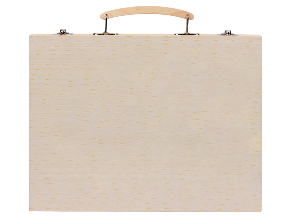 Набор из 67 предметов для рисования. Набор включает 12 акварельных красок, 12 цветных карандашей, 12 масляных пастелей, 12 фломастеров, 12 мелков, клей, резинку, точилку, карандаш HB, линейку и кисточку. Набор упакован в деревянный чемоданчик.