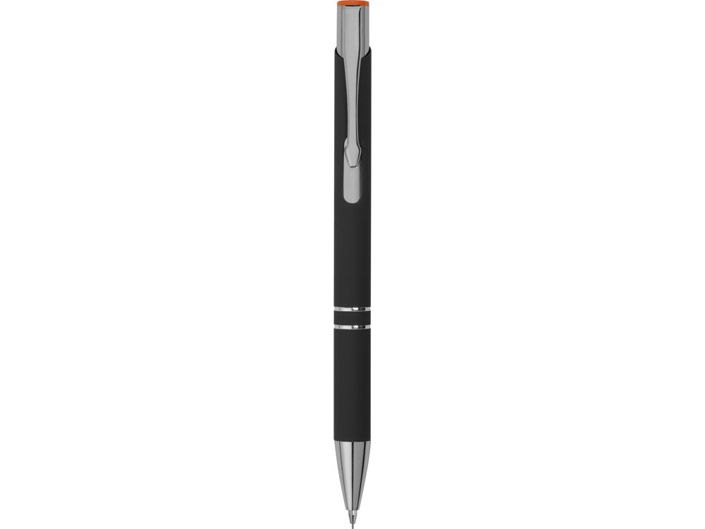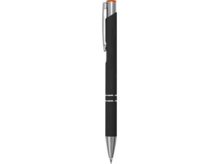 Черная шариковая ручка с кнопочным механизмом и тактильно приятным покрытием софт-тач. Цветная гравировка соответствует цвету кнопки и делает ее еще более изысканным подарком.