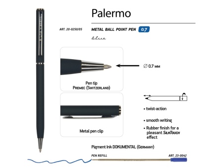 Автоматическая металлическая ручка Bruno Visconti серии Palermo однотонного цвета порадует любителей всего изящного и утонченного. Покрытие корпуса Soft Touch гарантирует дополнительный комфорт в работе с ней. Стержень легко выдвигается благодаря поворотному механизму. Синие пигментные чернила Dokumental (Германия) и пишущий узел Premec (Швейцария) обеспечивают качественное и мягкое письмо.