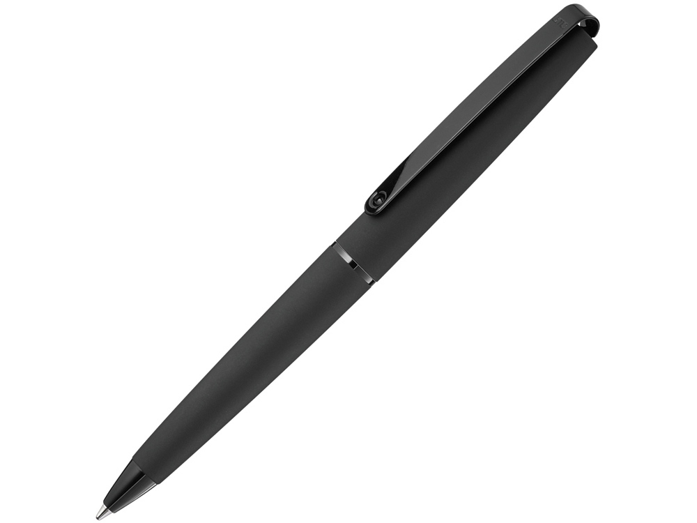 Металлическая шариковая ручка с мягким поворотным механизмом, матовым лакированным корпусом, длинным гибким металлическим клипом, декоративное кольцо и наконечник с глянцевой отделкой в черном цвете.