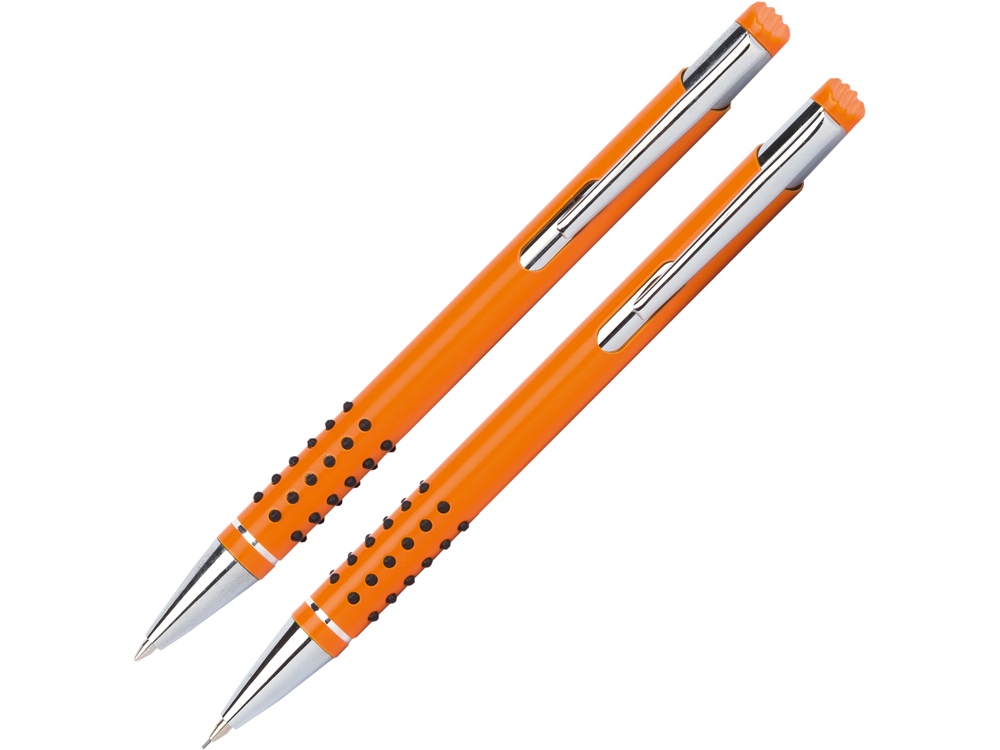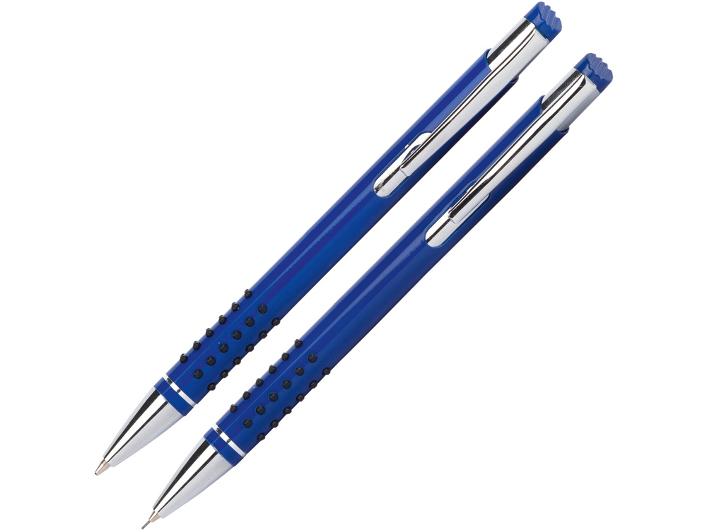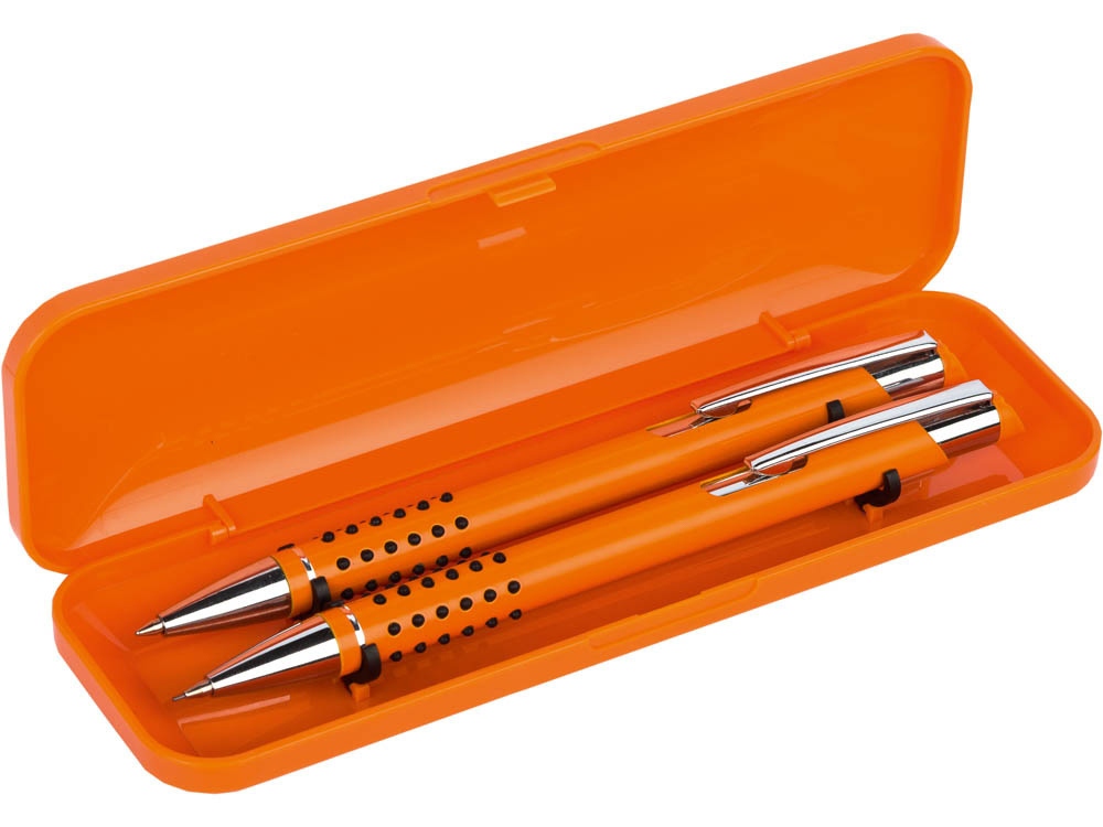 Набор письменных принадлежностей, состоящий из шариковой ручки с нажимным механизмом и механического карандаша, предлагается в компактном пластиковом футляре. На ручку, карандаш и футляр можно нанести логотип и подарить в качестве сувенира или небольшого презента клиенту компании.