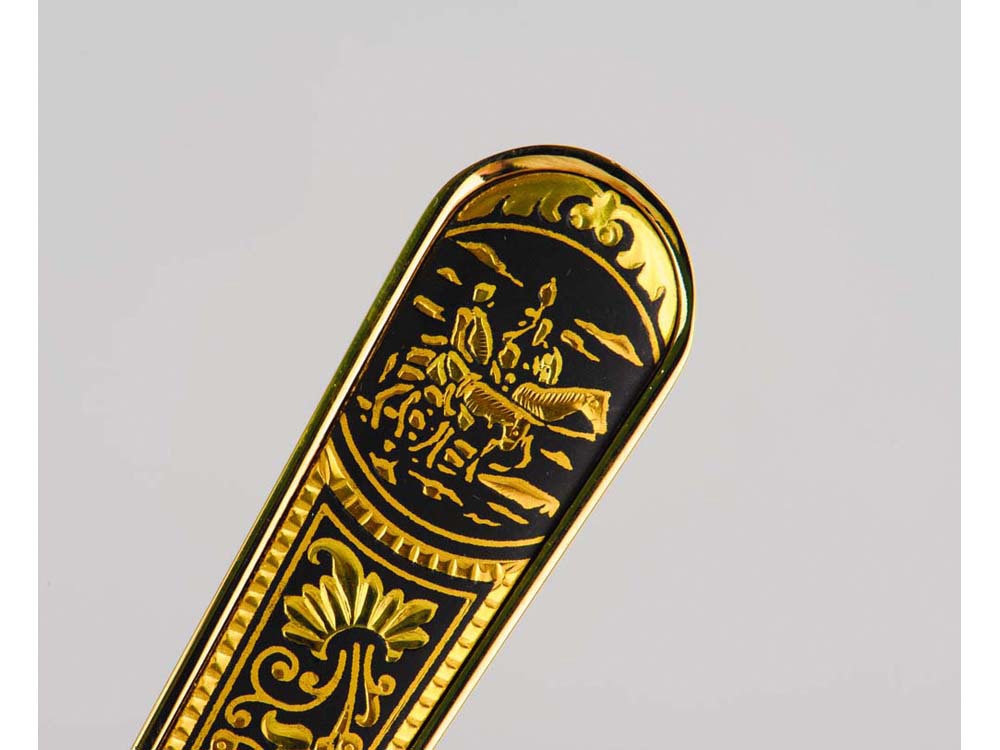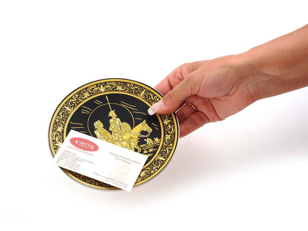 Набор: тарелочка для визитных карточек, нож для бумаги и шариковая ручка Дон Кихот и Санчо Панса. Дон Кихот в умах цивилизованного человечества всегда был символом беспримерного благородства и рыцарства. Именно поэтому мы обратились к мастерам испанского города Толедо с просьбой создать подарки на тему Дон Кихот. Сначала появились шахматы, которые были и остаются шедевром ювелирного искусства. Мы поблагодарили испанцев и включили в каталог шахматы, но чего-то нам не хватало. Шахматы для дома, – рассуждали мы, – но ведь о благородстве что-то должно напоминать и на работе. Поняли, - сказали мастера Толедо и создали офисный бизнес-набор Дон Кихот и Санчо Панса, который ничуть не уступает по уровню шахматам. Впрочем, судить, конечно, Вам.